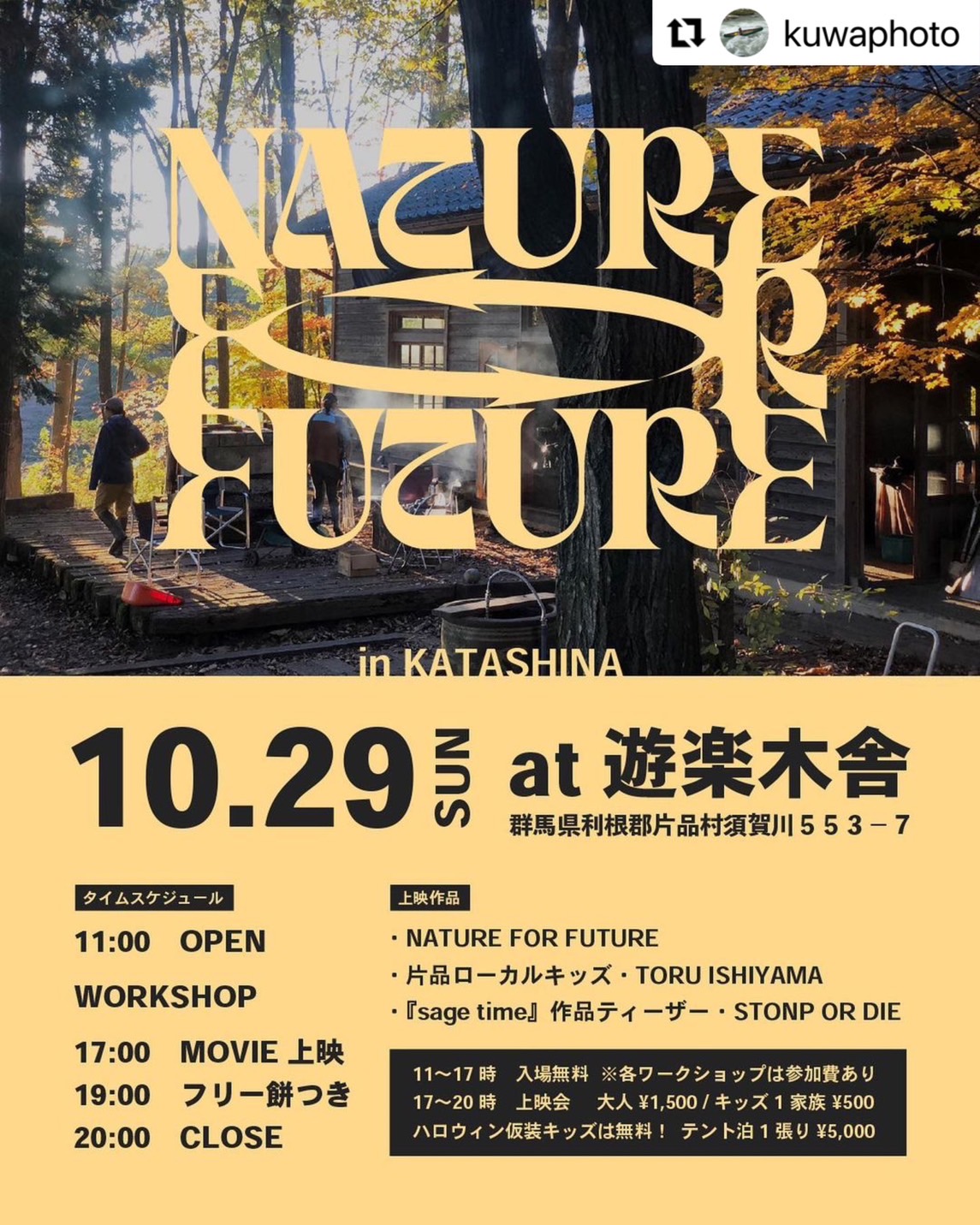 ※昼間のワークショップは、入場無料ですが、夜の上映会とテント泊は予約制となりますのでご注意ください。