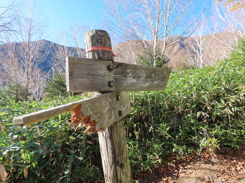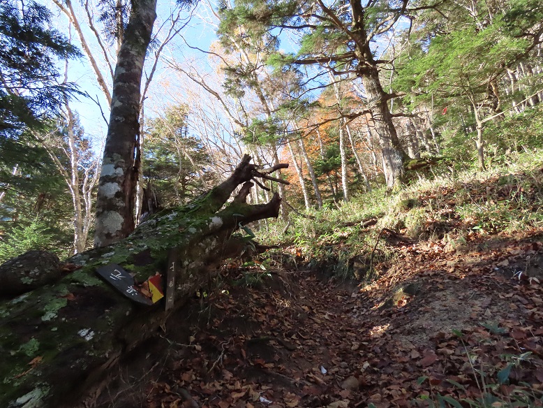 【道標(左)も荒廃の中ッ曽根急斜面】