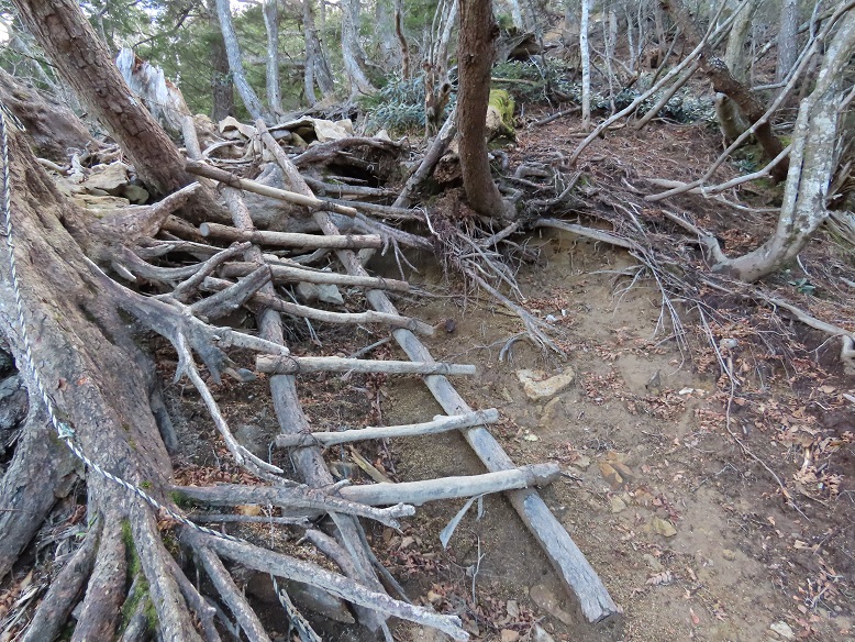 【荒廃登山道の丸太梯子】