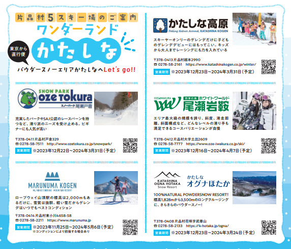 「道の駅尾瀬かたしな」からオグナほたか・かたしな高原・ホワイトワールド尾瀬岩鞍・スノーパーク尾瀬戸倉・丸沼高原への各スキー場へは、無料シャトルバスが運行します。