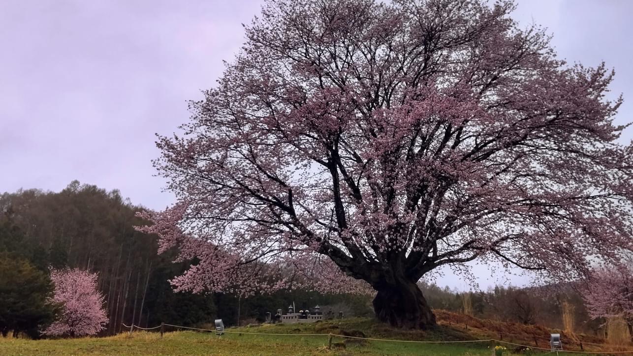 天王桜の奥に見える桜は天王桜の子供です。周囲に何本もの子供たちがいます。