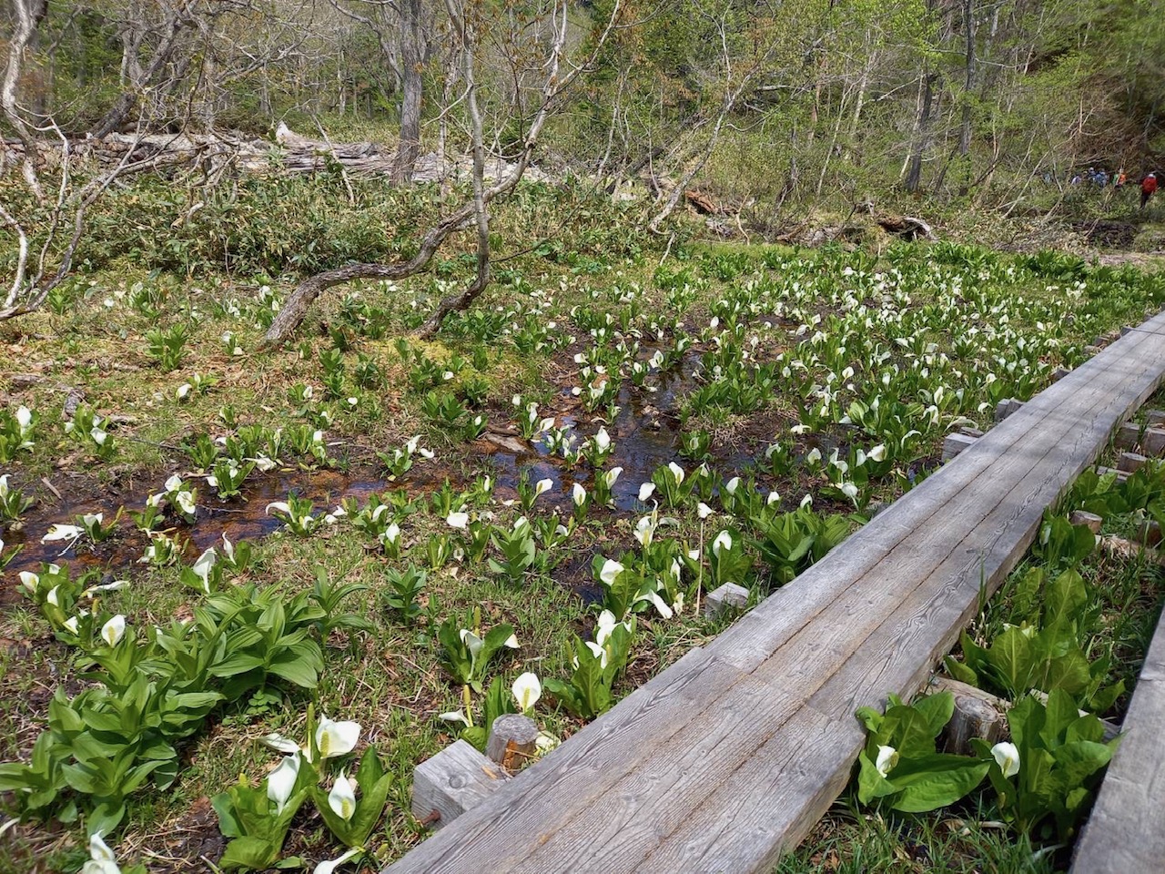 日に日にミズバショウは大きくなり、若干見頃は過ぎていますが、研究見本園では小さいミズバショウがご覧いただけます。