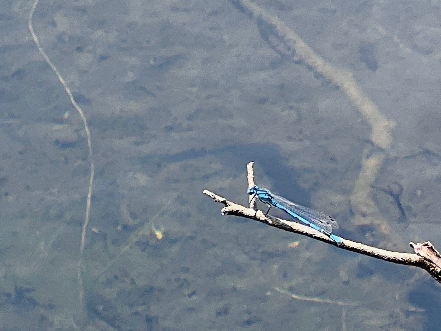 池塘付近でゆらりと飛ぶイトトンボを見つけました。