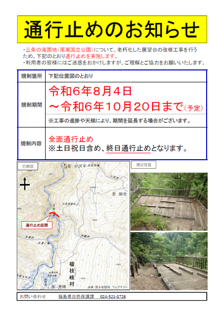 三条の滝園地(尾瀬国立公園)について、老朽化した展望台の改修工事を行うため、下記の期間が通行止めとなります。大変ご迷惑をおかけいたしますが、ご理解とご協力のほどよろしくお願いいたします。