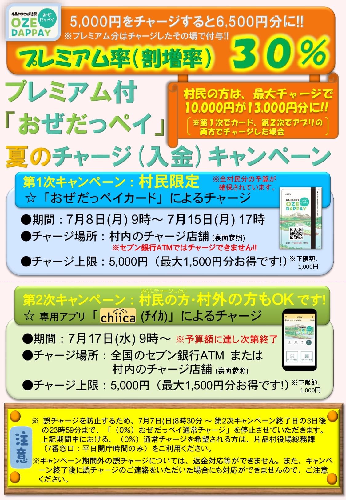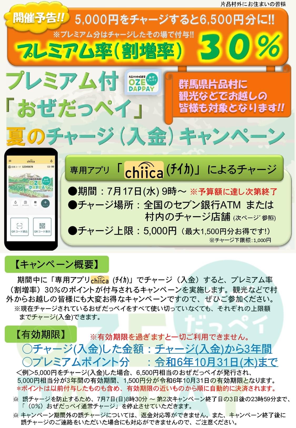 プレミアム率(割増率)30%のプレミアム付き「おぜだっペイ」夏のチャージ(入金)キャンペーンが始まります♪