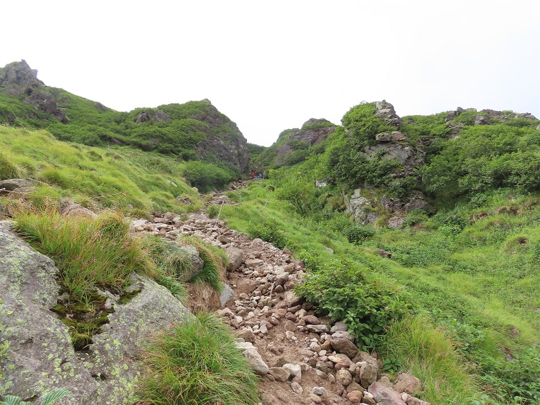 狭い登山道での追い抜きやすれ違い時の草地の踏み付け、転倒・滑落に要注意⚠