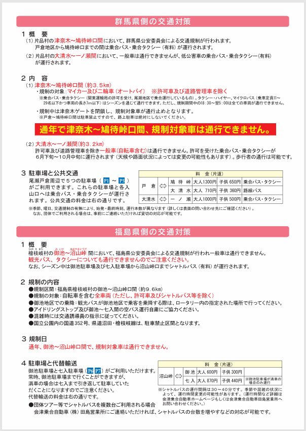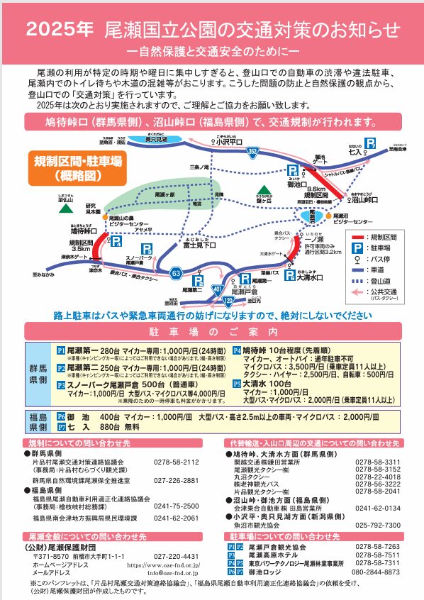 尾瀬の利用が特定の時期や曜日に集中しすぎると、登山口での自動車の渋滞や違法駐車、尾瀬内でのトイレ待ちや木道の混雑等がおこります。こうした問題の防止と自然保護の観点から、