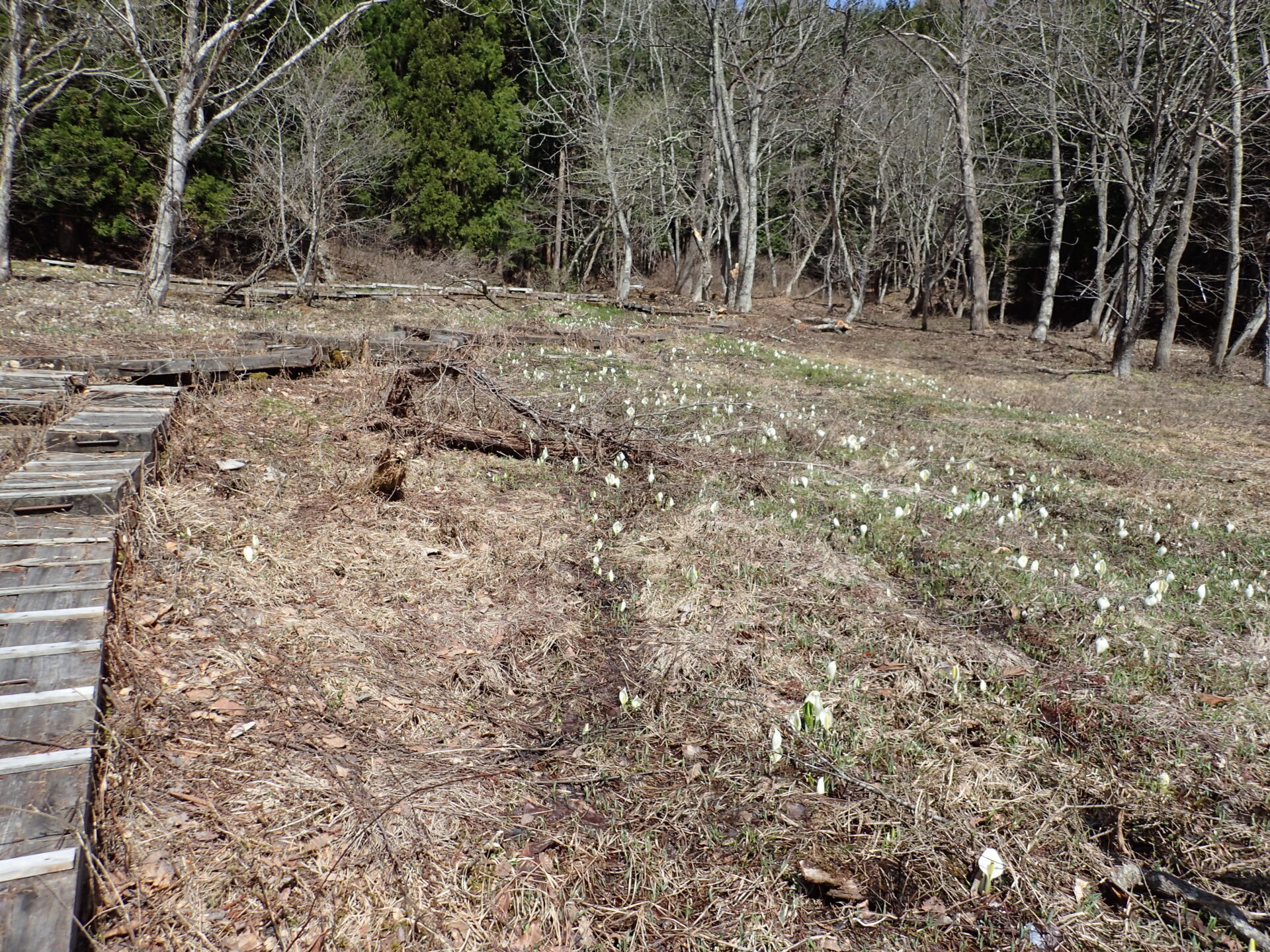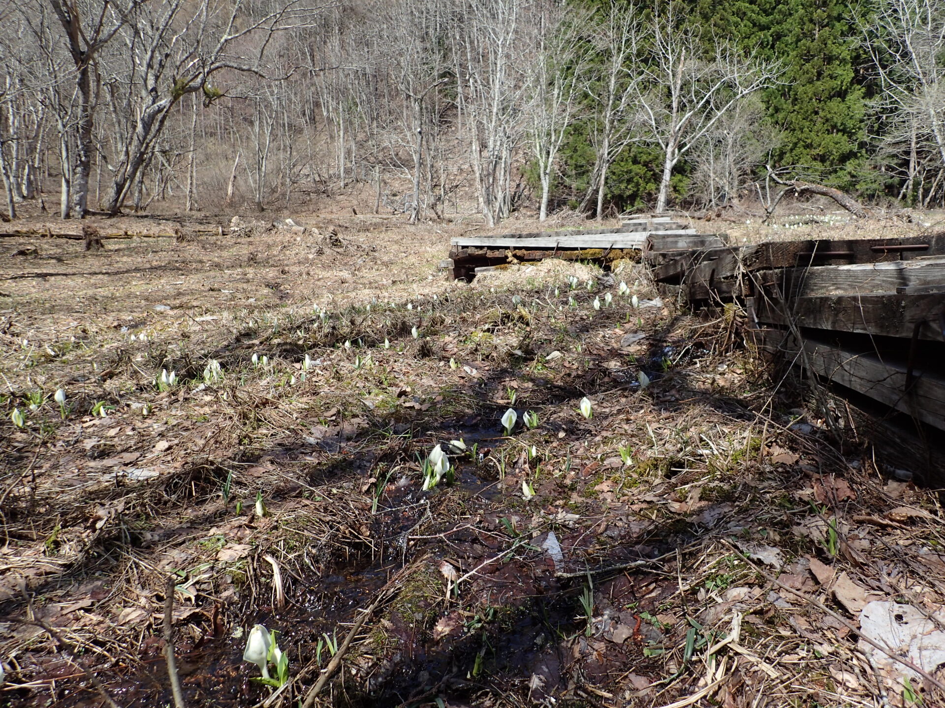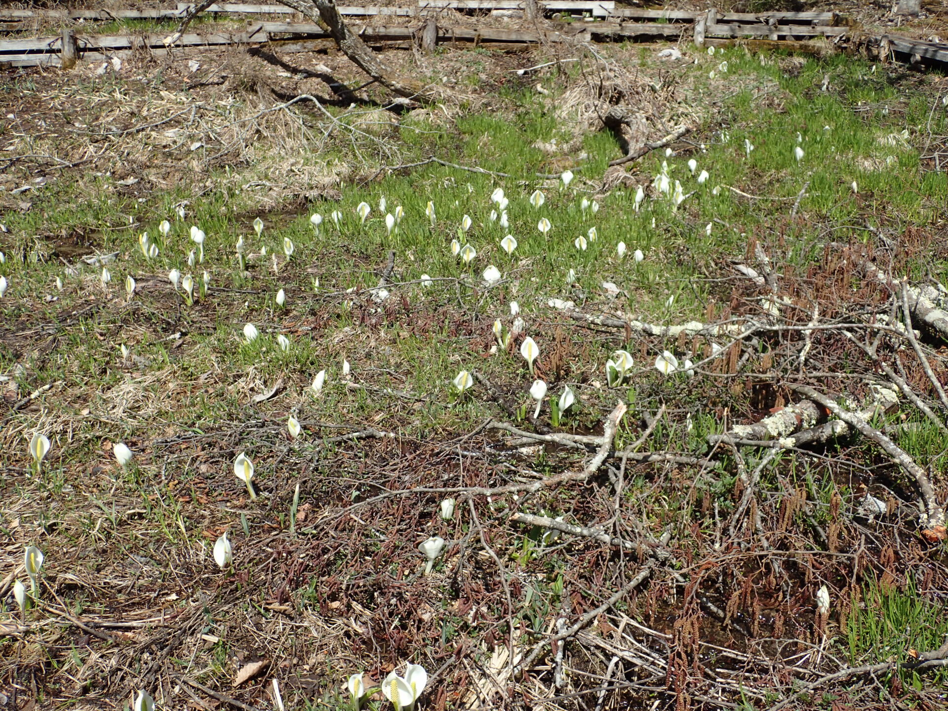 週末の暖かさで残雪も解け、越本水芭蕉の森では、現在ミズバショウが2~3分咲きとなりました。