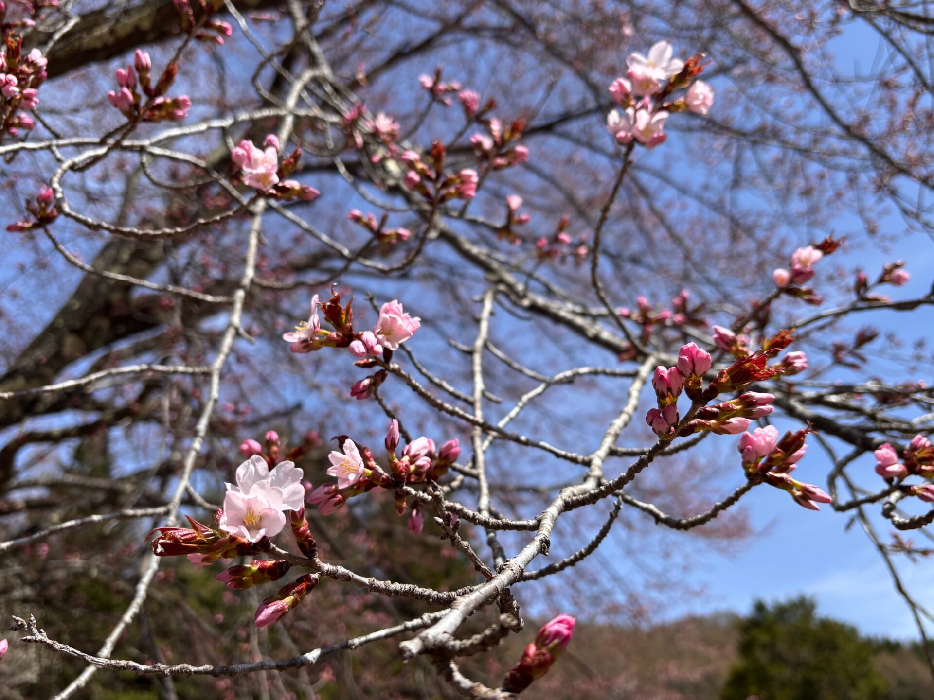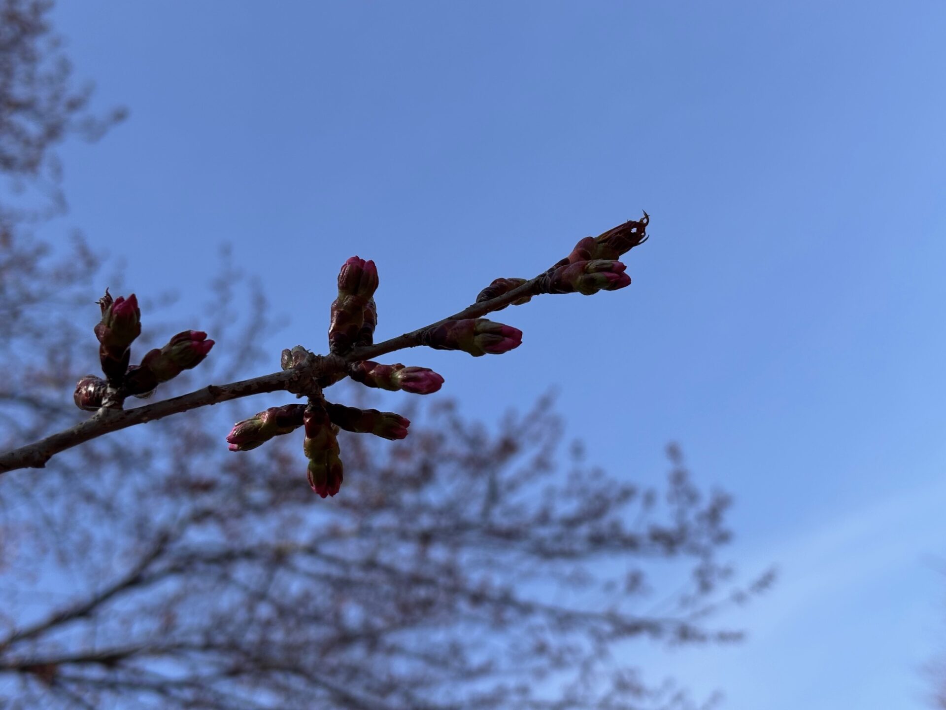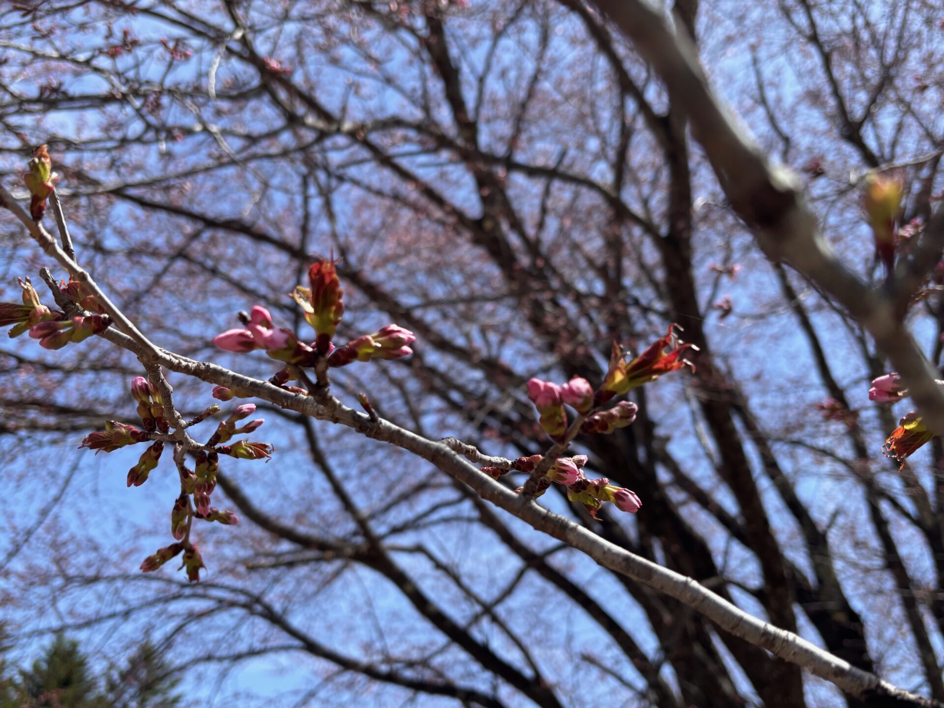 オキノ桜は、蕾が膨らみ、先端も色づき始めていますが、まだ開花はしていません。