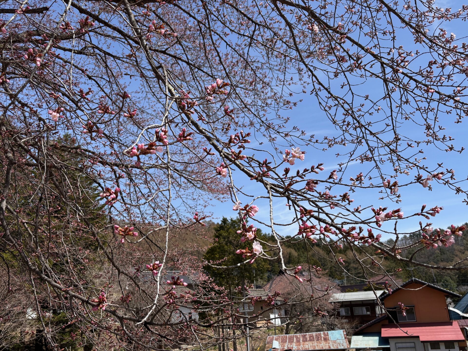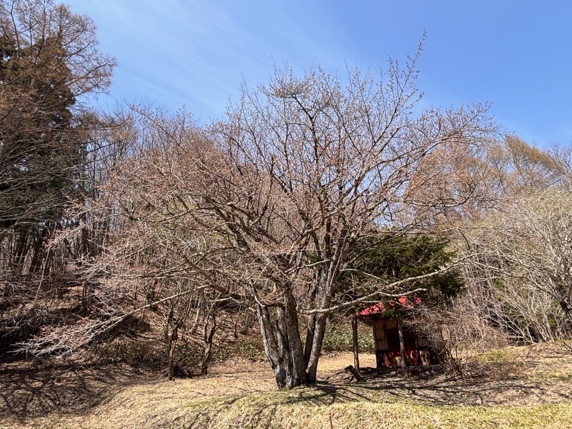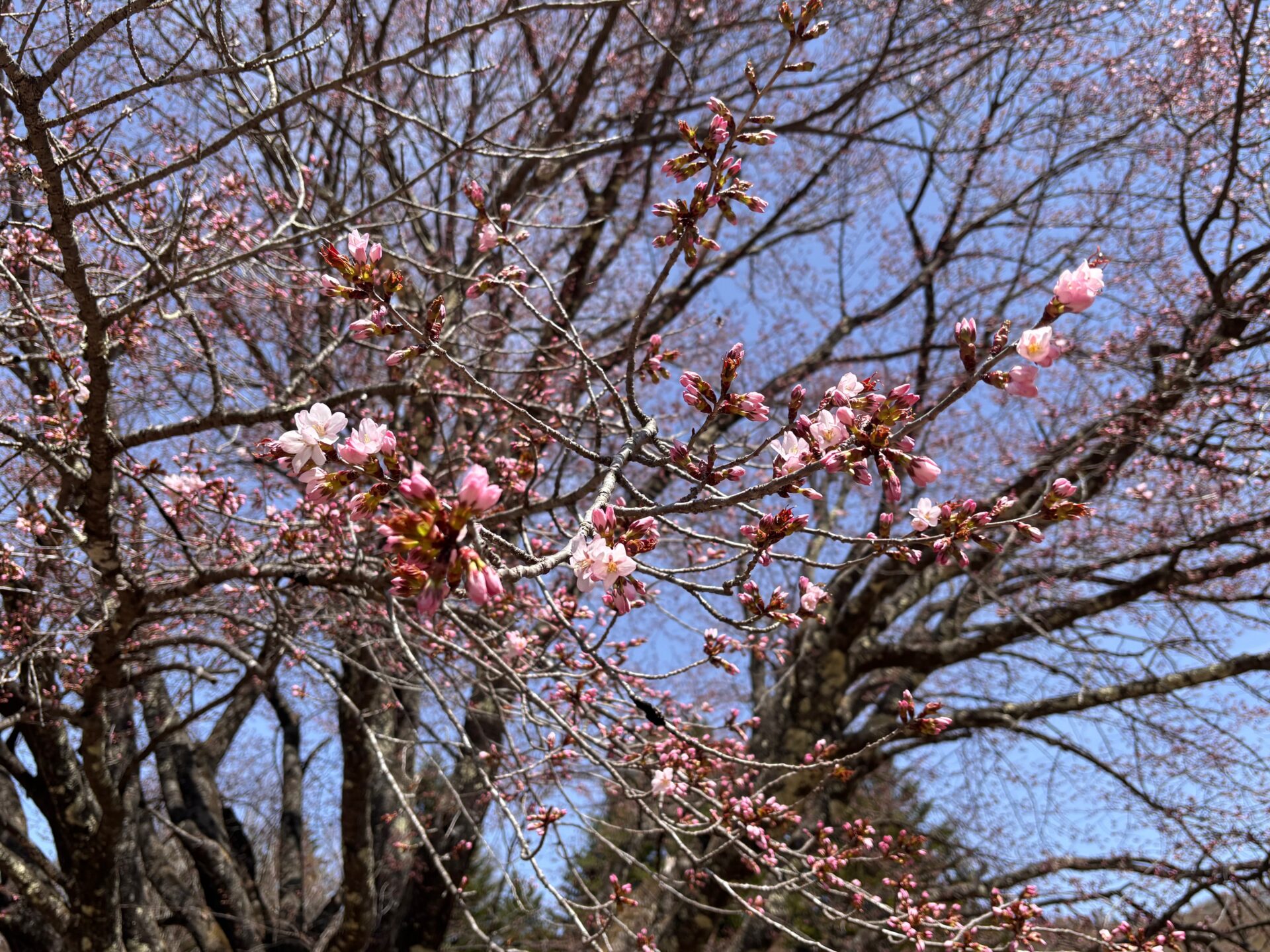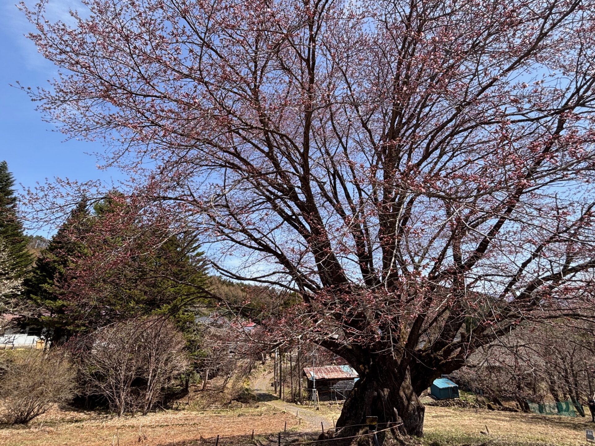 オキノ桜は、蕾が膨らみ、先端も色づき始めていますが、まだ開花はしていません。