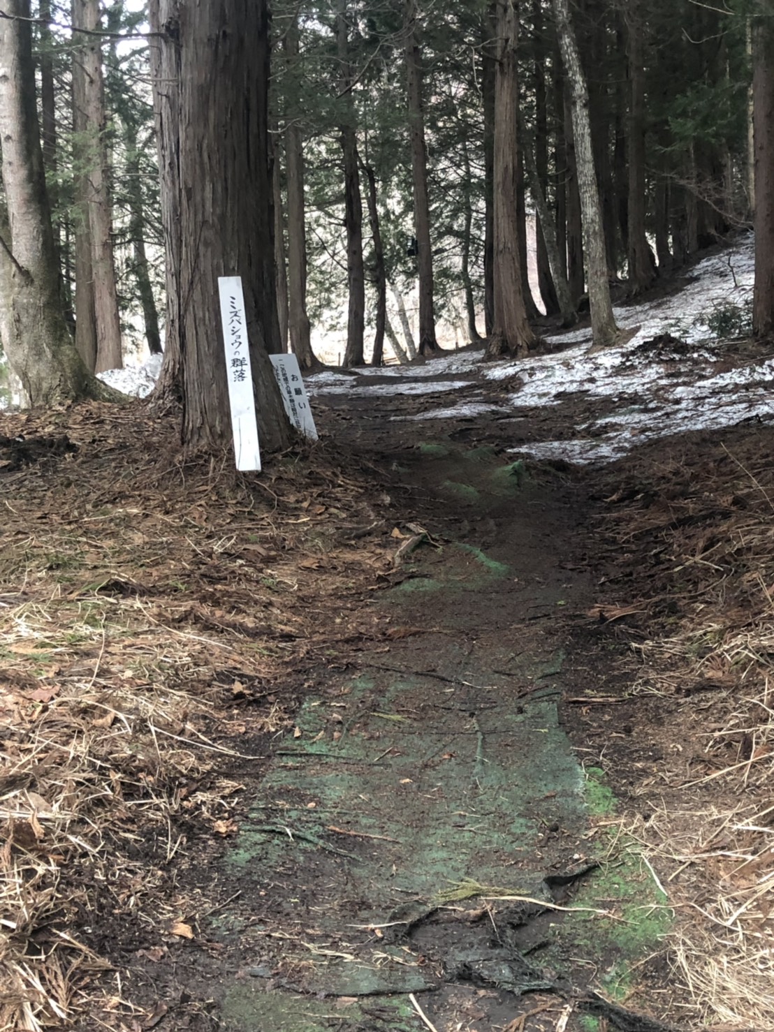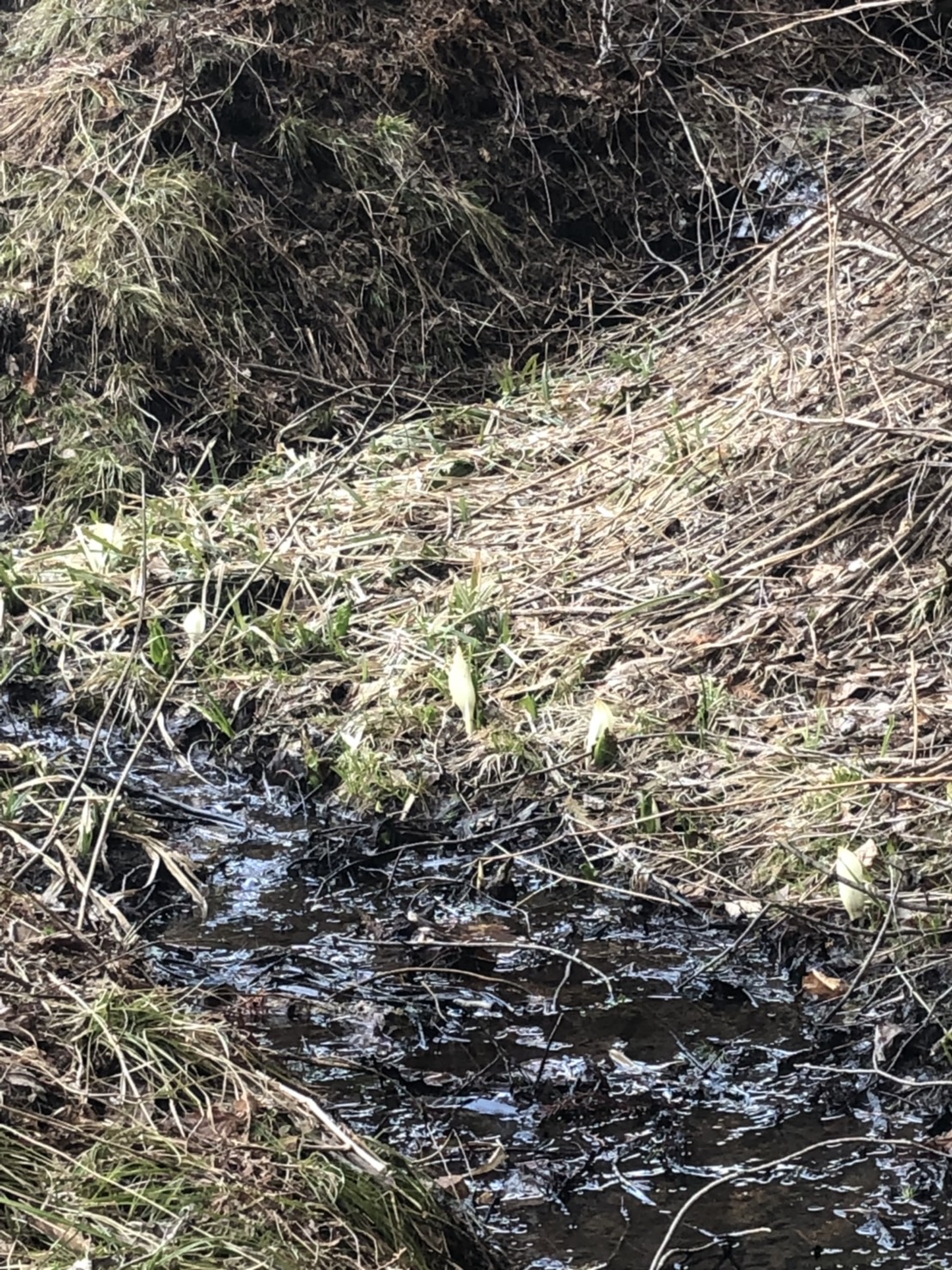 越本水芭蕉の森では、ここ数日の暖かさで雪も解け、日のあたりの良い一部分では、ミズバショウが少しずつ顔を出して始めていました。