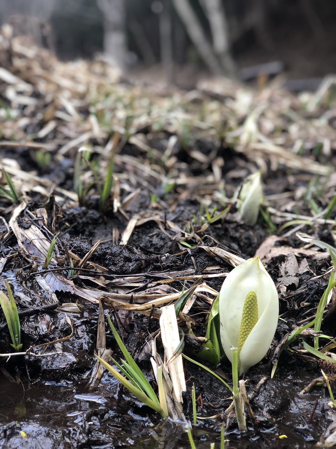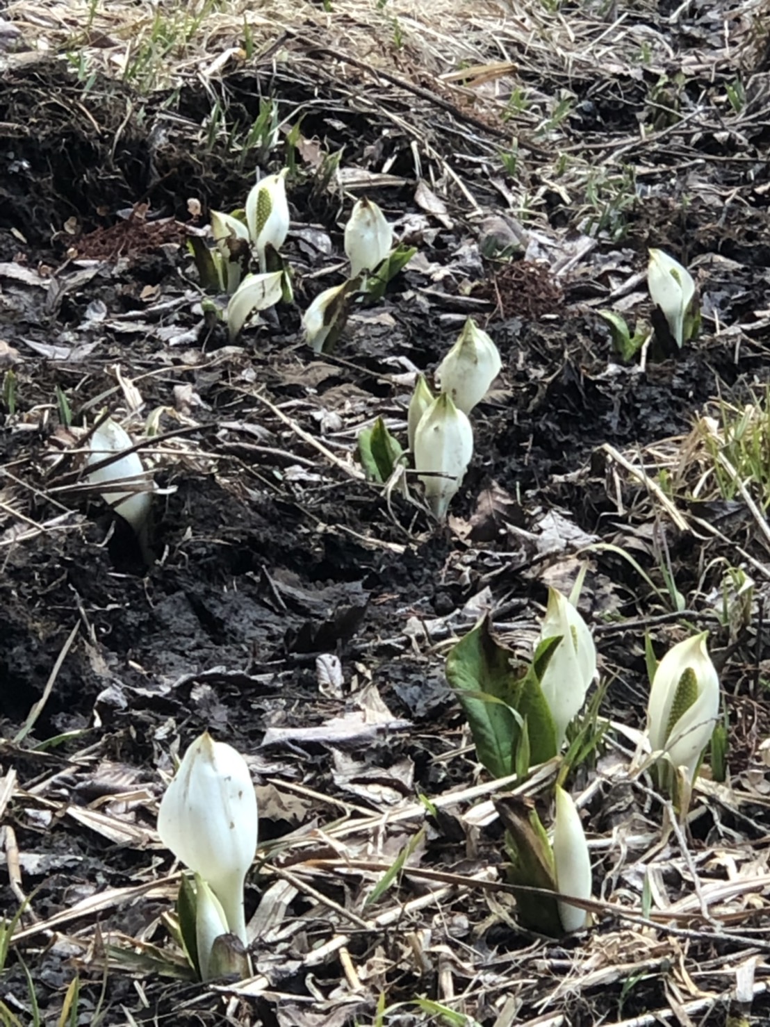 可憐な姿の小さいミズバショウがポツポツ咲いてはいますが、全体の1分咲きといったところかと思います。
