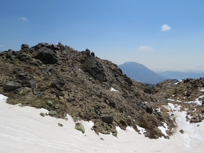 【夏道の厚い残雪、右奥に根名草山】