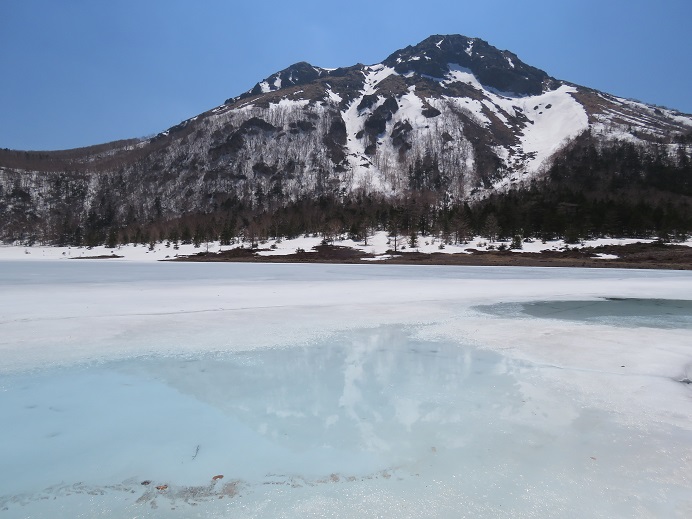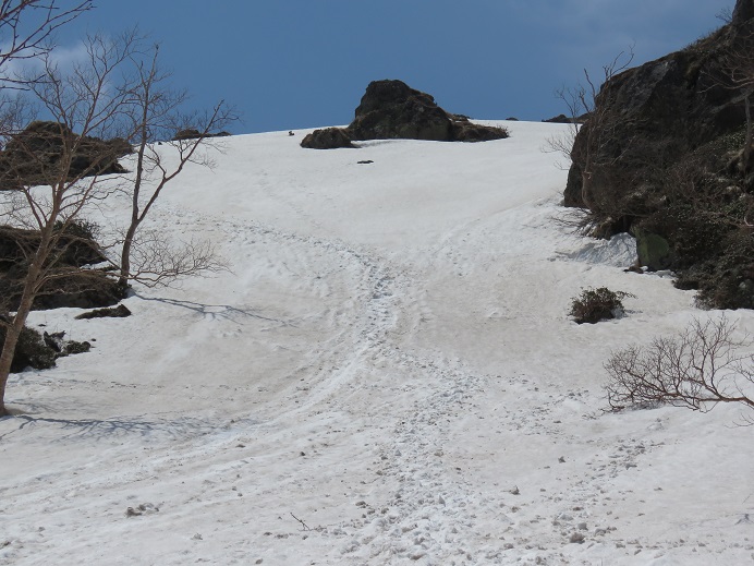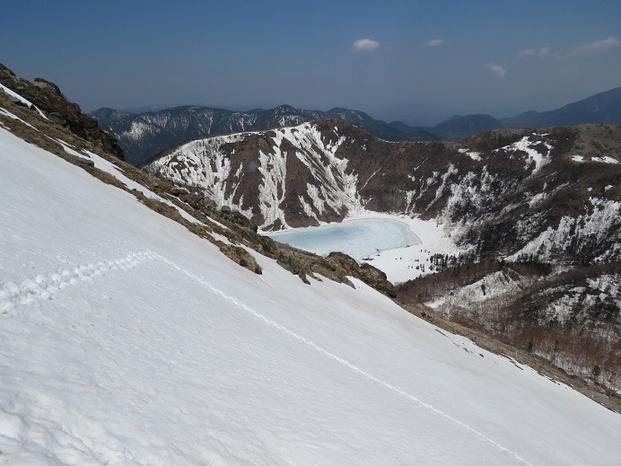 弥陀ヶ池や五色沼は全面凍結ですが緩み始めていて、山頂直下急斜面、特に東面上部残雪の横断痕が不明瞭です。