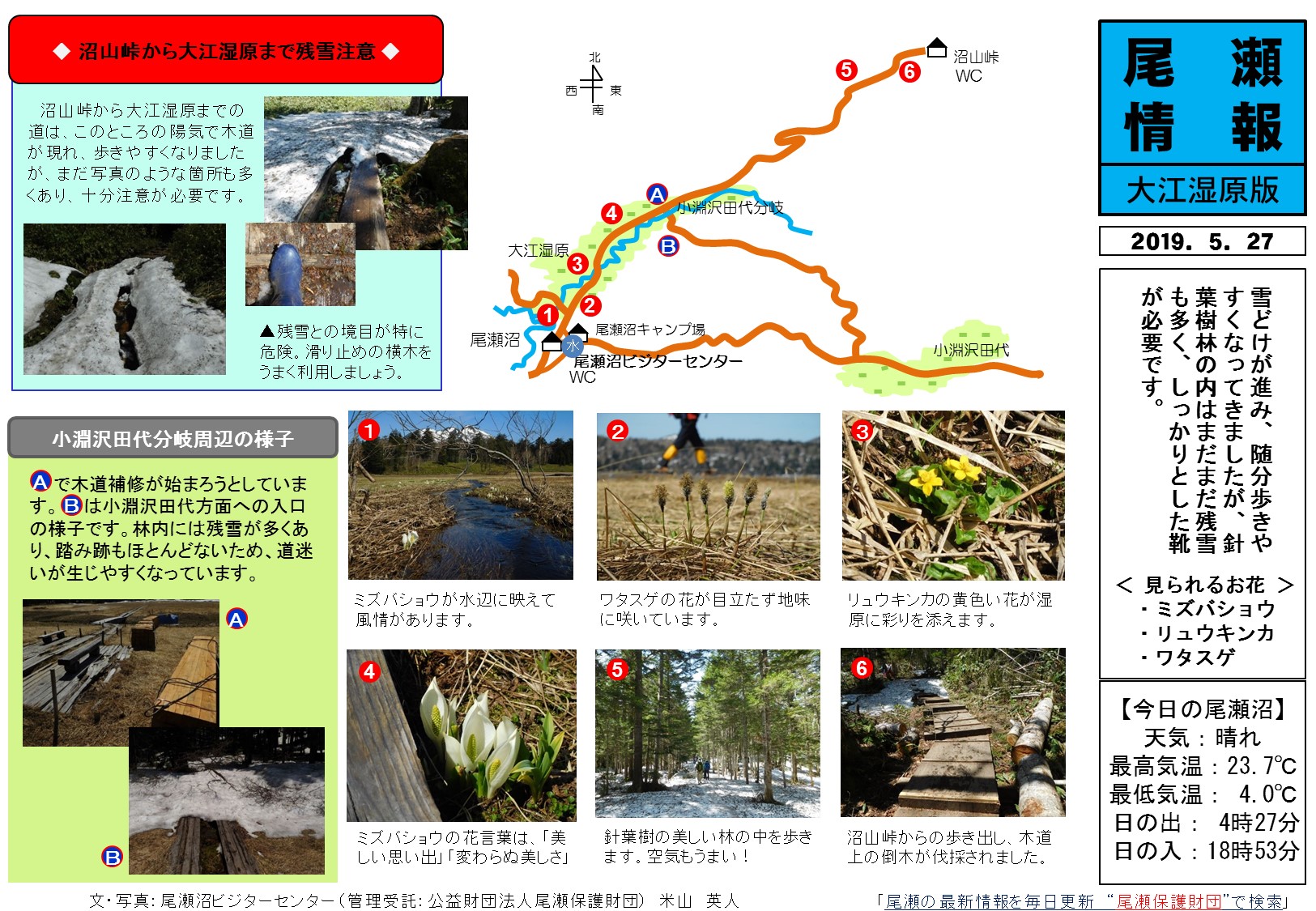 沼山峠から大江湿原までの道は、このところ陽気で木道が現れ、歩きやすくなりましたが、まだ十分注意が必要です。残雪との境目が特に危険です。