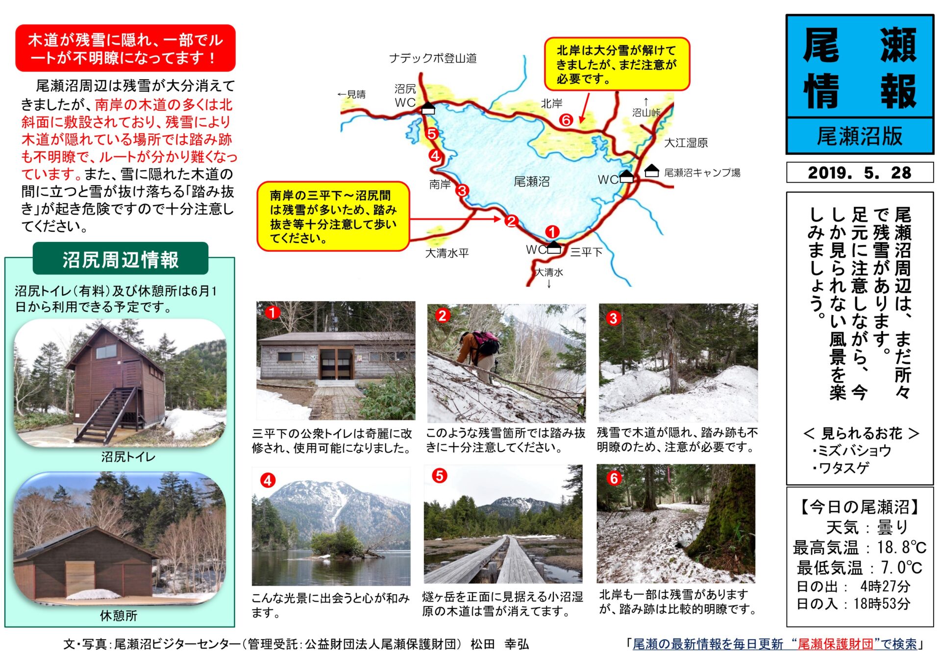尾瀬沼周辺は残雪がだいぶ消えてきましが、南岸の木道の多くは北斜面に敷設されており、残雪により木道が隠れている場所では踏み跡も不明瞭で、ルートがわかり難くなっています。また、雪に隠れた木道の間に立つと雪が抜け落ちる『踏み抜き』が起き危険ですので十分注意してください。