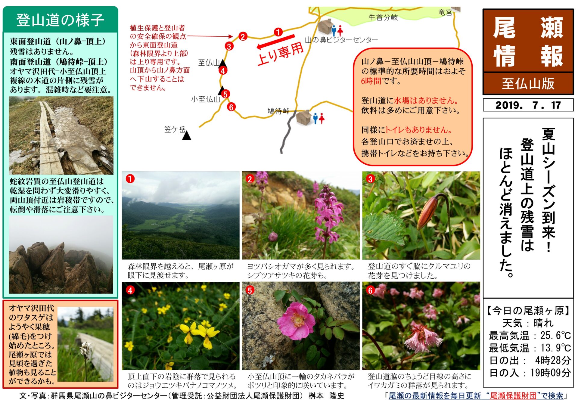蛇紋岩質の至仏山登山道は乾湿を問わず、大変滑りやすく、両山頂付近和は岩稜帯ですので、転倒や滑落にご注意ください⚠