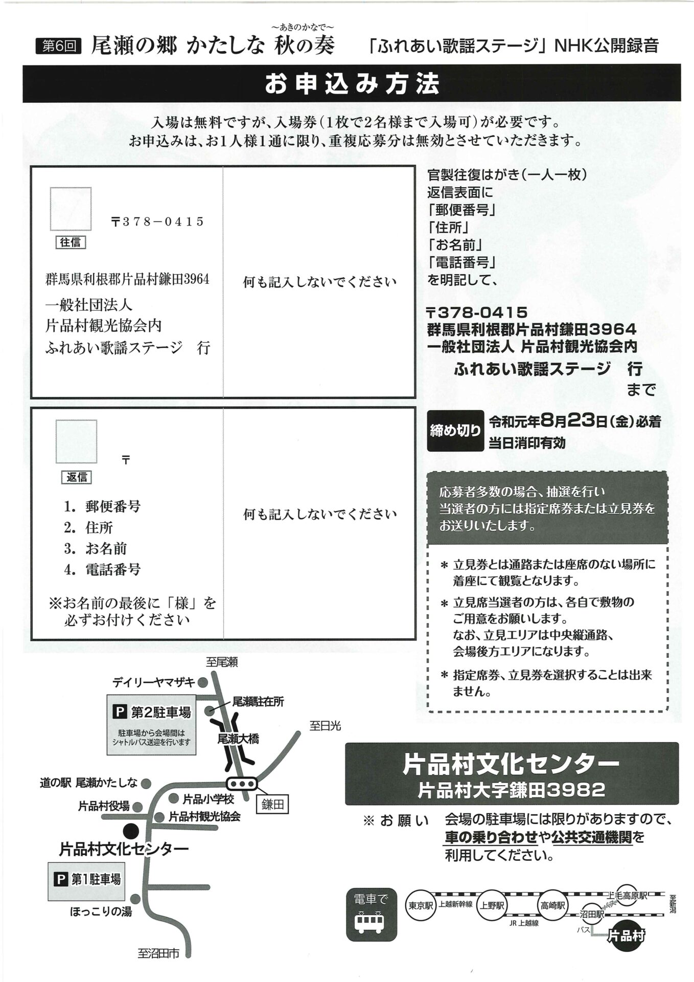 お申し込み方法をご確認いただき、(一社)片品村観光協会まで、往復はがきにてお送りください。