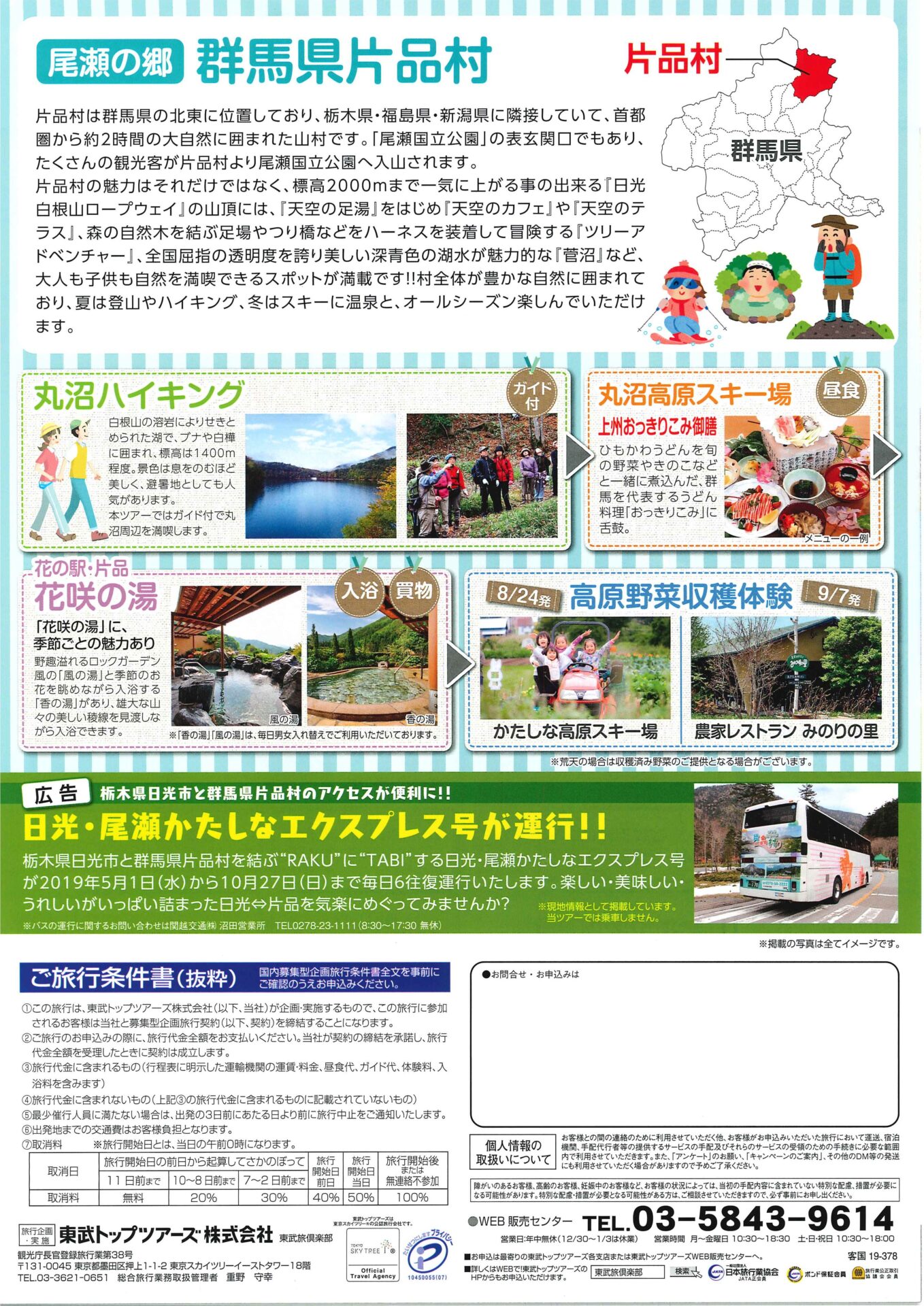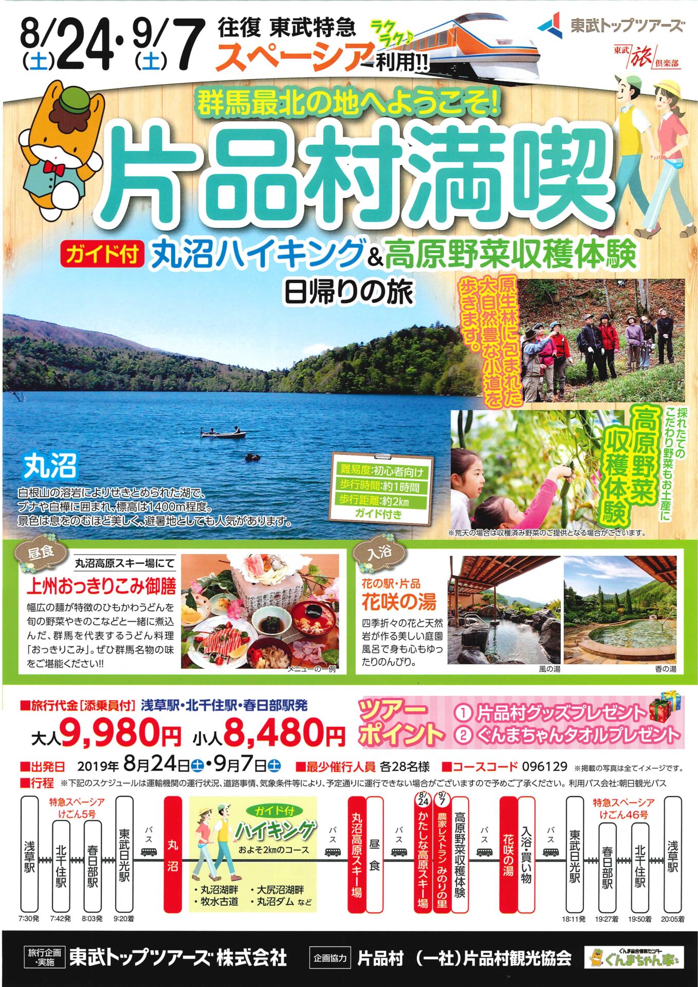行程:特急スペーシア🚃 ⇒ 丸沼ハイキング(およそ2kmコース:ガイド付き) ⇒ 丸沼高原スキー場【昼食:上州おっきりこみ御膳】 ⇒ 高原野菜収穫体験 ⇒ 花の駅・片品『花咲の湯』(入浴・買い物)⇒ 特急スペーシア🚃