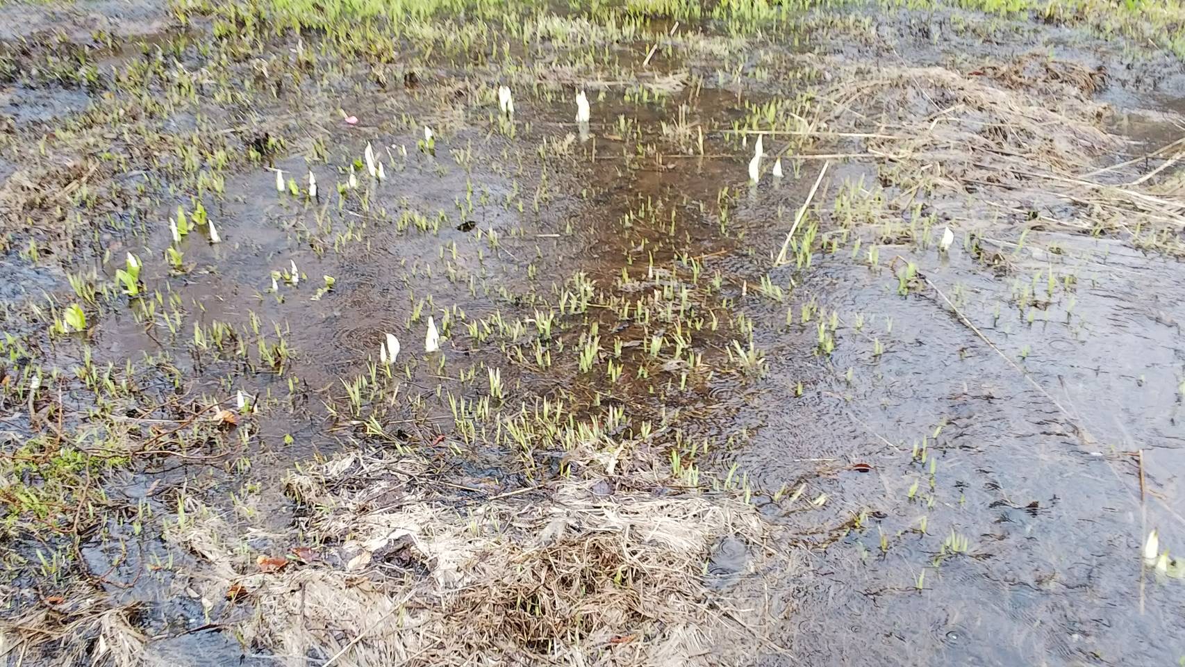 予報通り雨が降り続けていますが、大清水湿原と、越本水芭蕉の森のミズバショウの様子です。