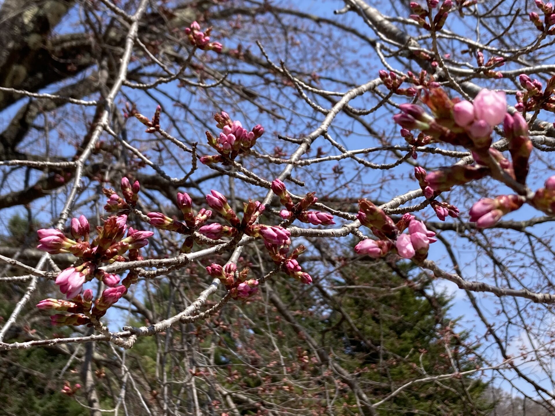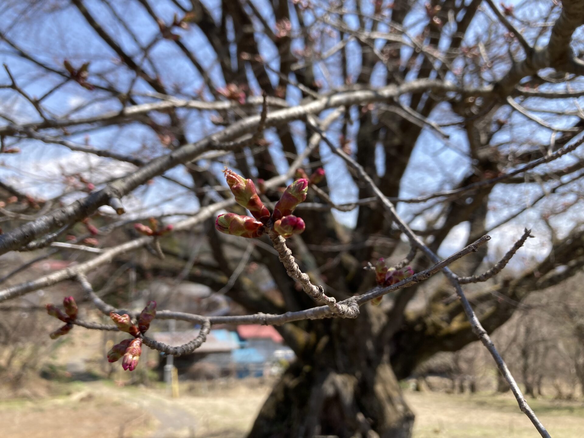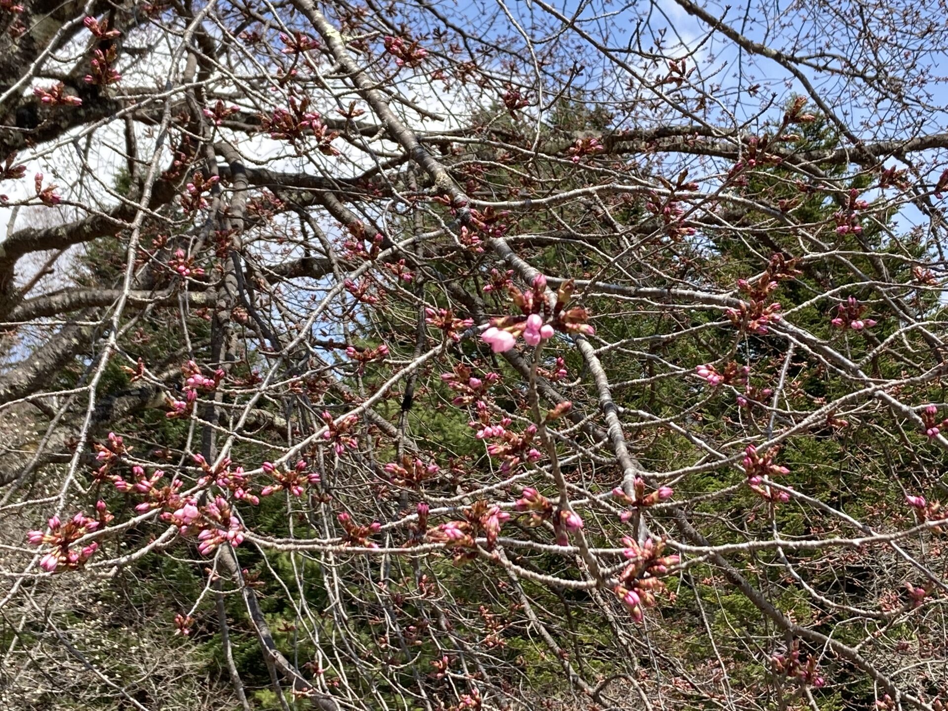 針山の天王桜ですが、全体的に色づきも濃くなり、陽の当たりの良い南側で4~5輪ほど開花いたしました!!