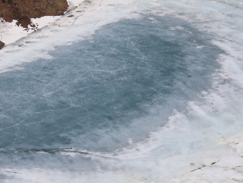 部分的に開いた弥陀ヶ池は勿論、五色沼歩行は氷が割れる認識を。