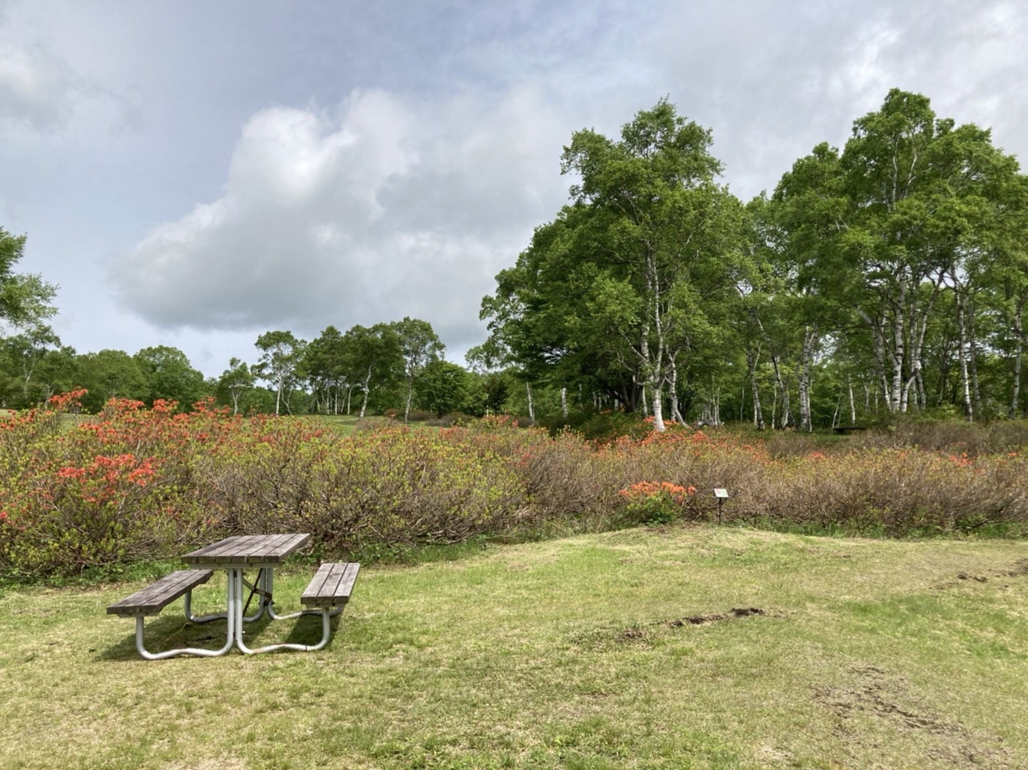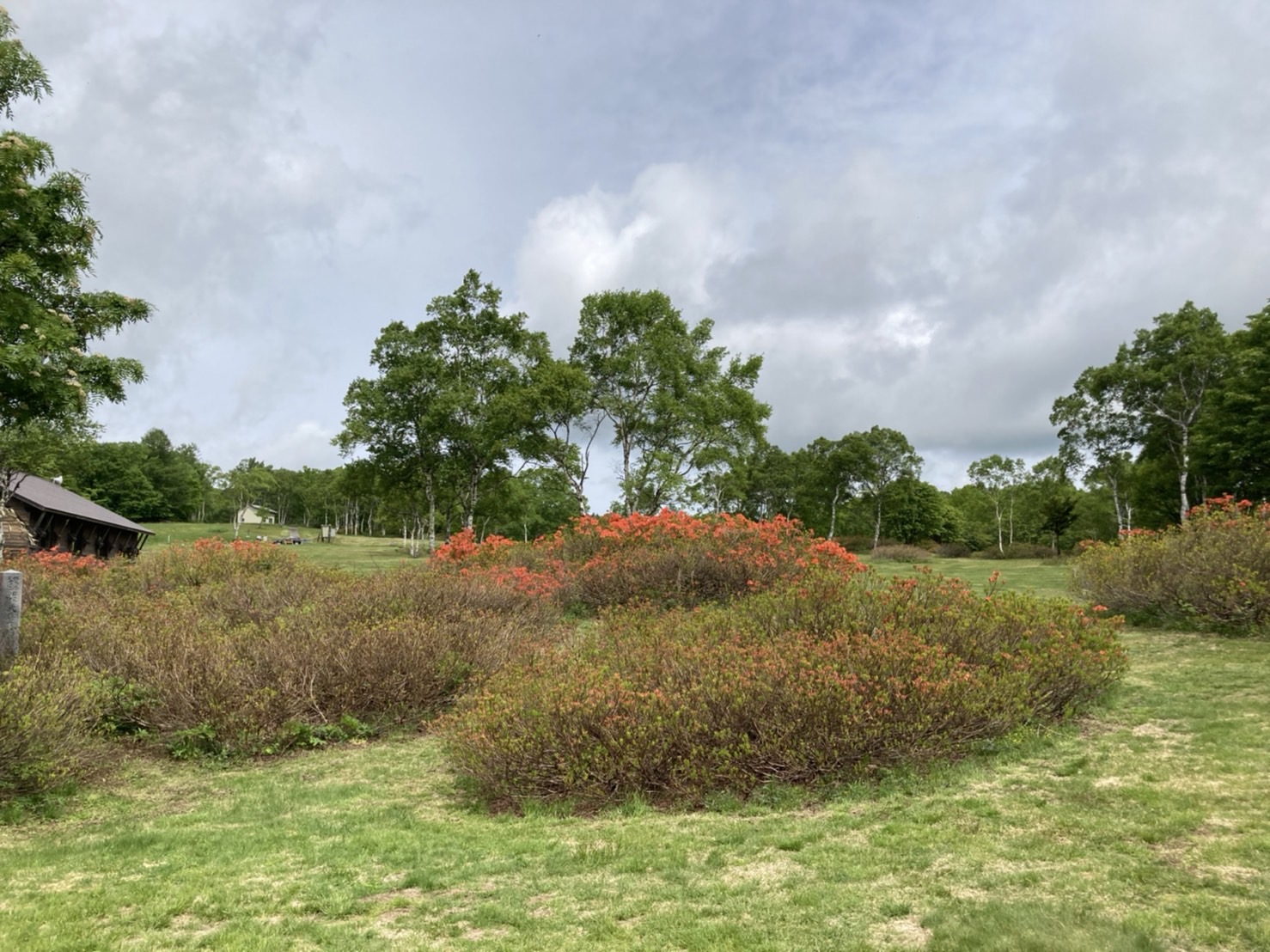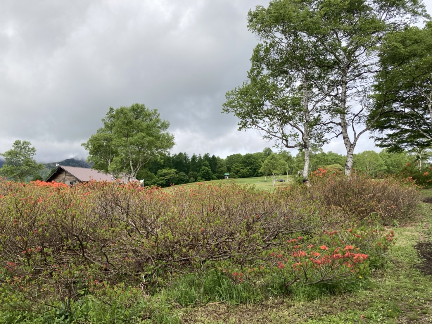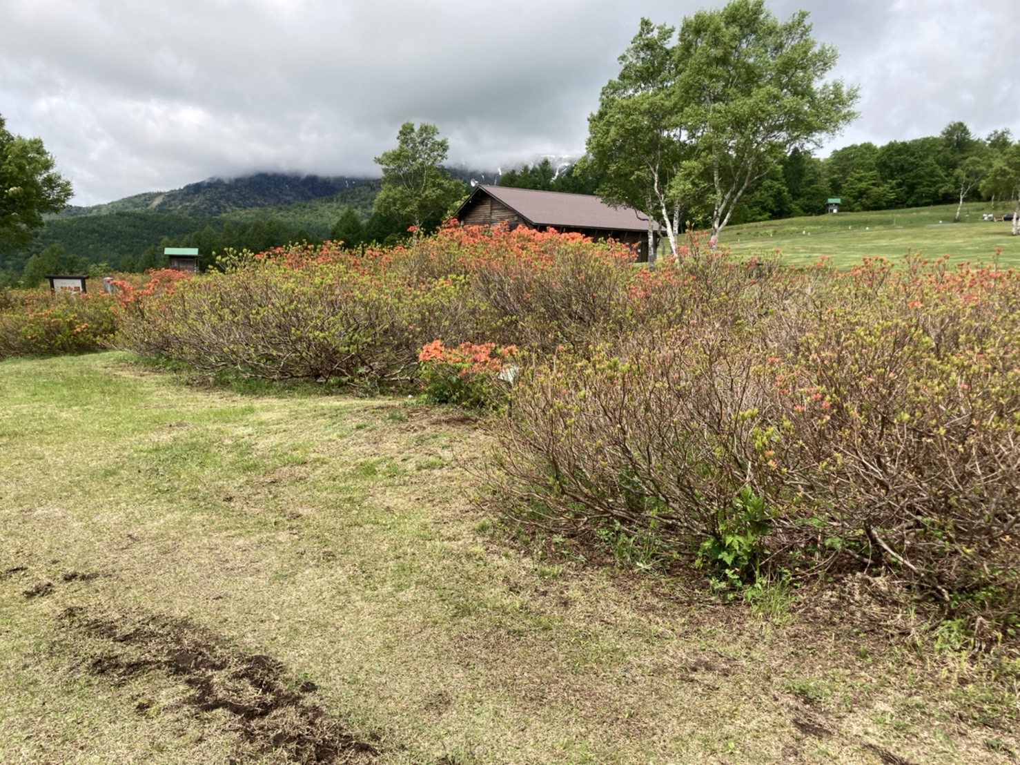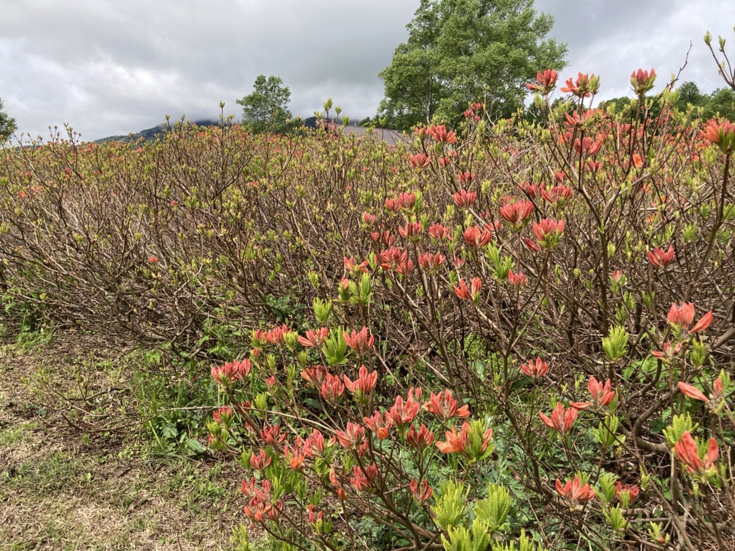 ほたか牧場のレンゲツツジは全体の半分くらいは赤く色づき始め、3割ほど開花も始まっています。