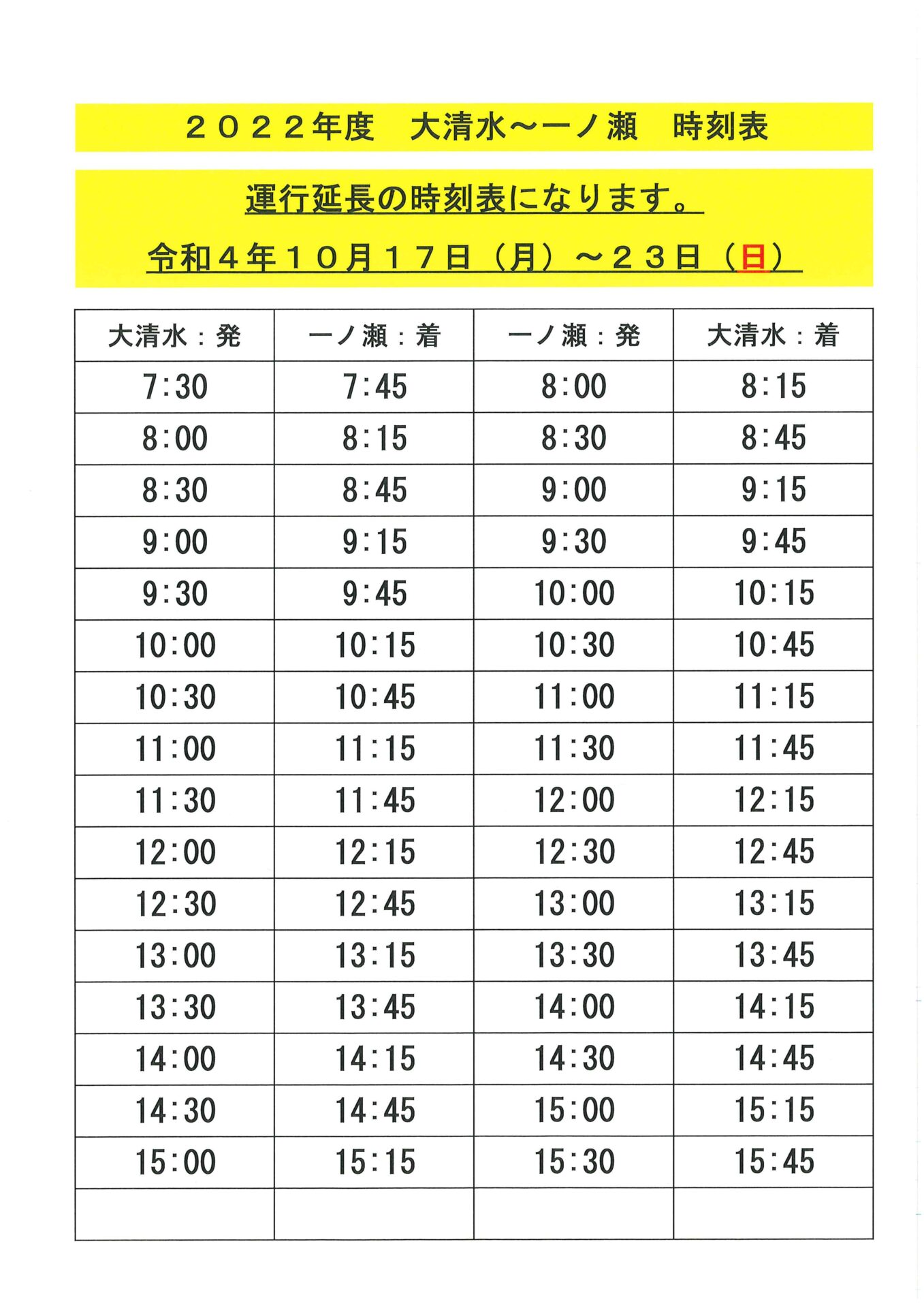 大清水~一ノ瀬間の低公害車運行が10月16日(日)までの予定でしたが、10月23日(日)まで延長となりましたので、お知らせさせていただきます。