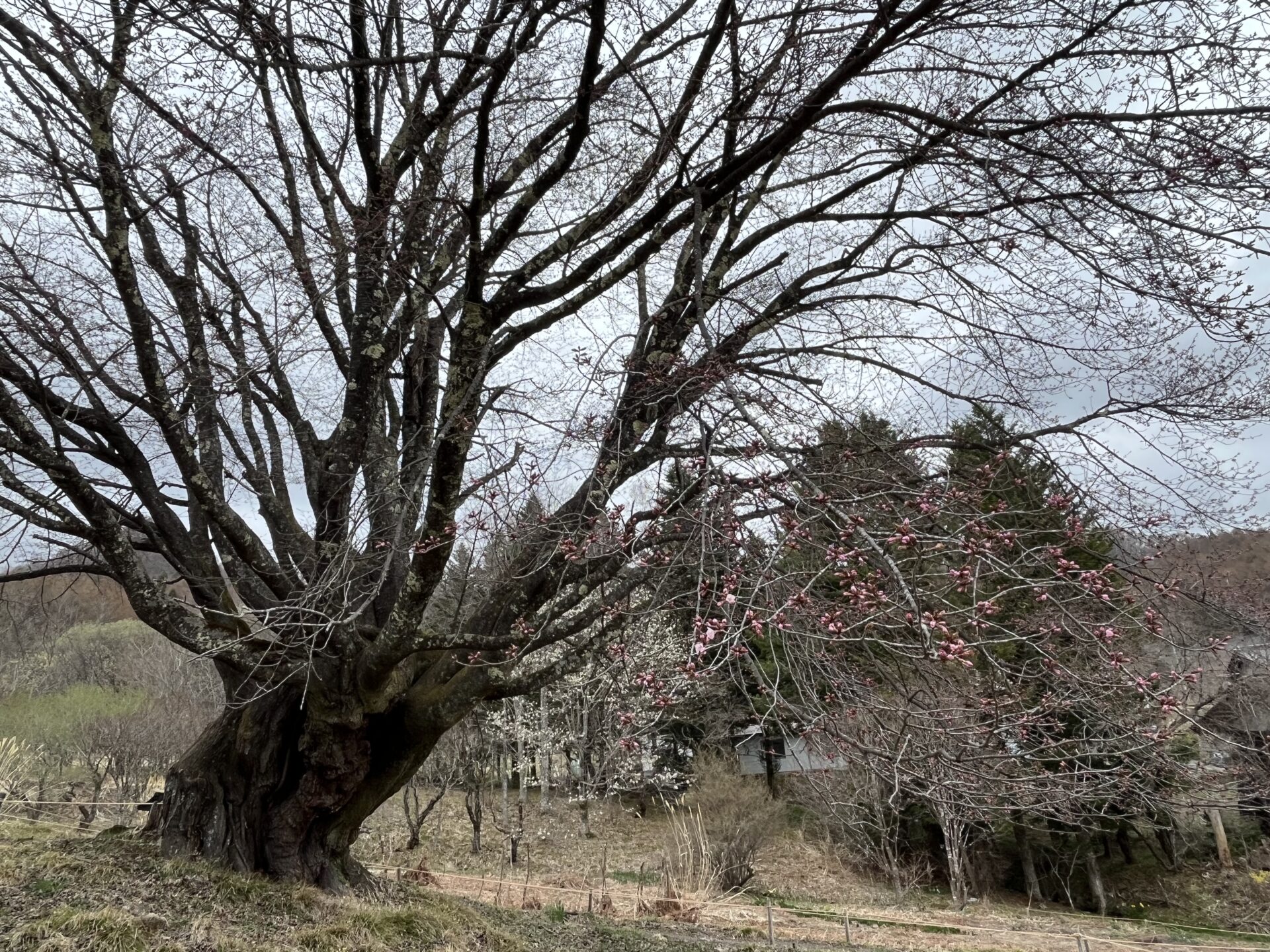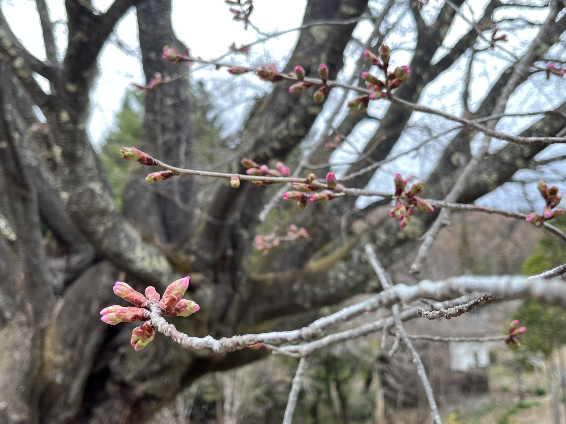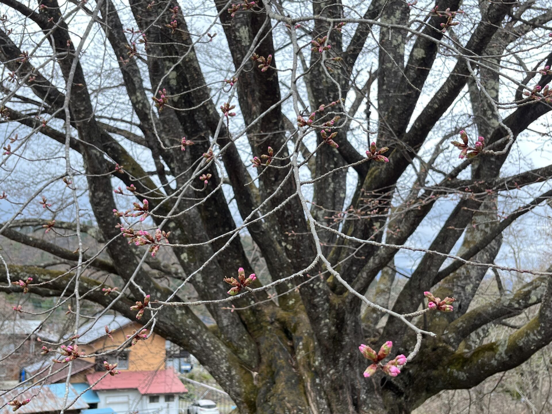 そんななか、針山の天王桜ですが、遠目からでも色づきが分かるほど蕾の色づきも進み、日の当たりの良い南側で3輪開花いたしました!