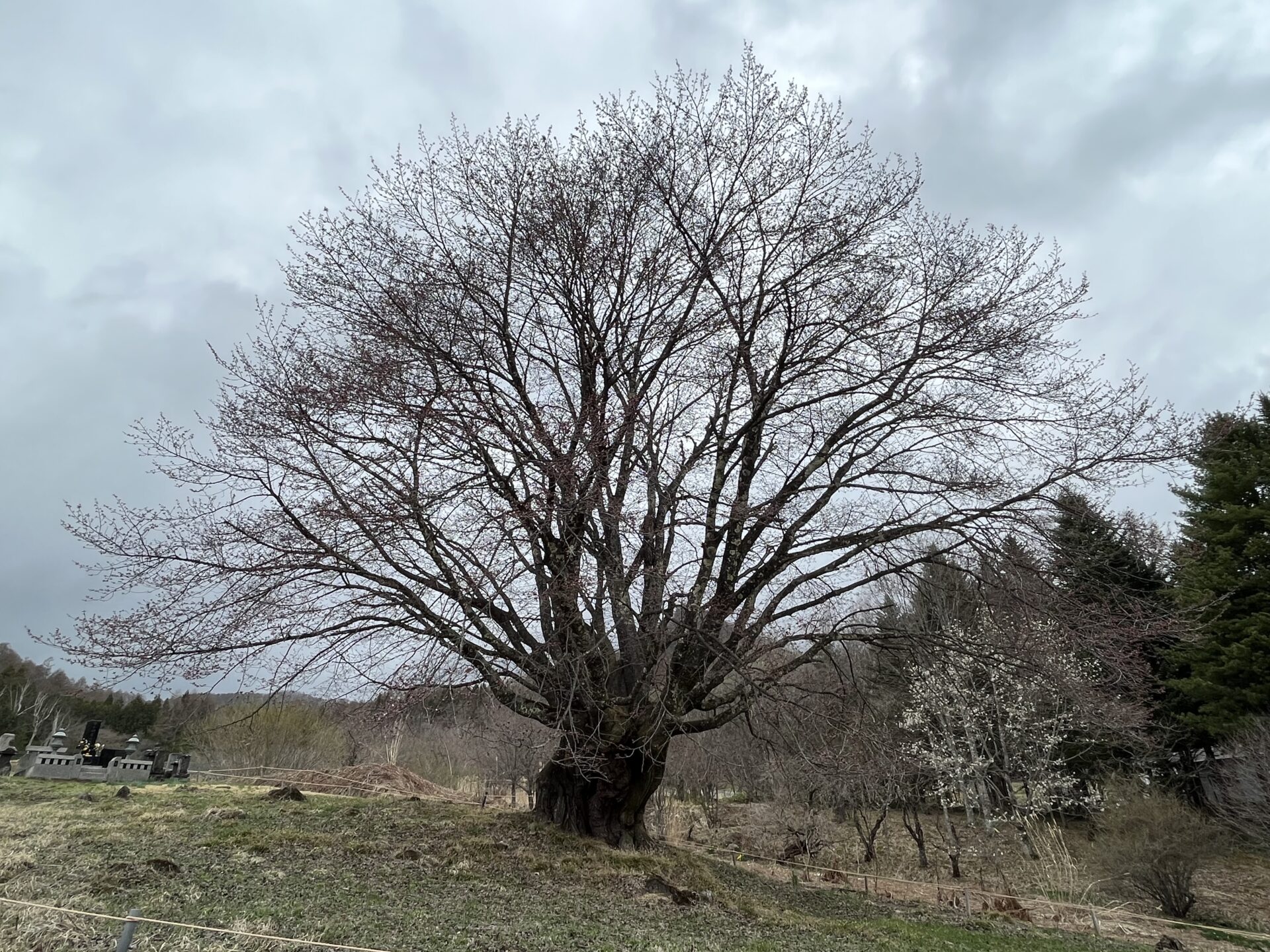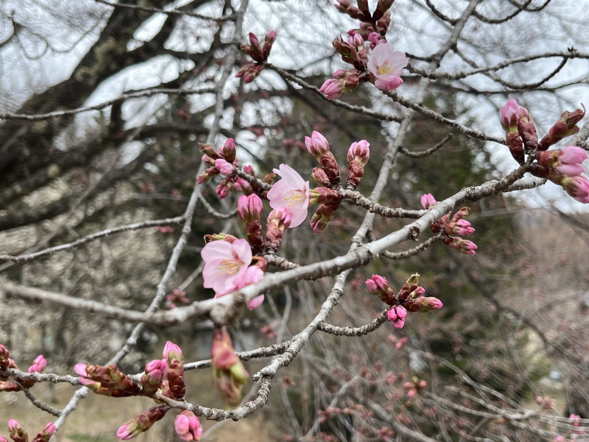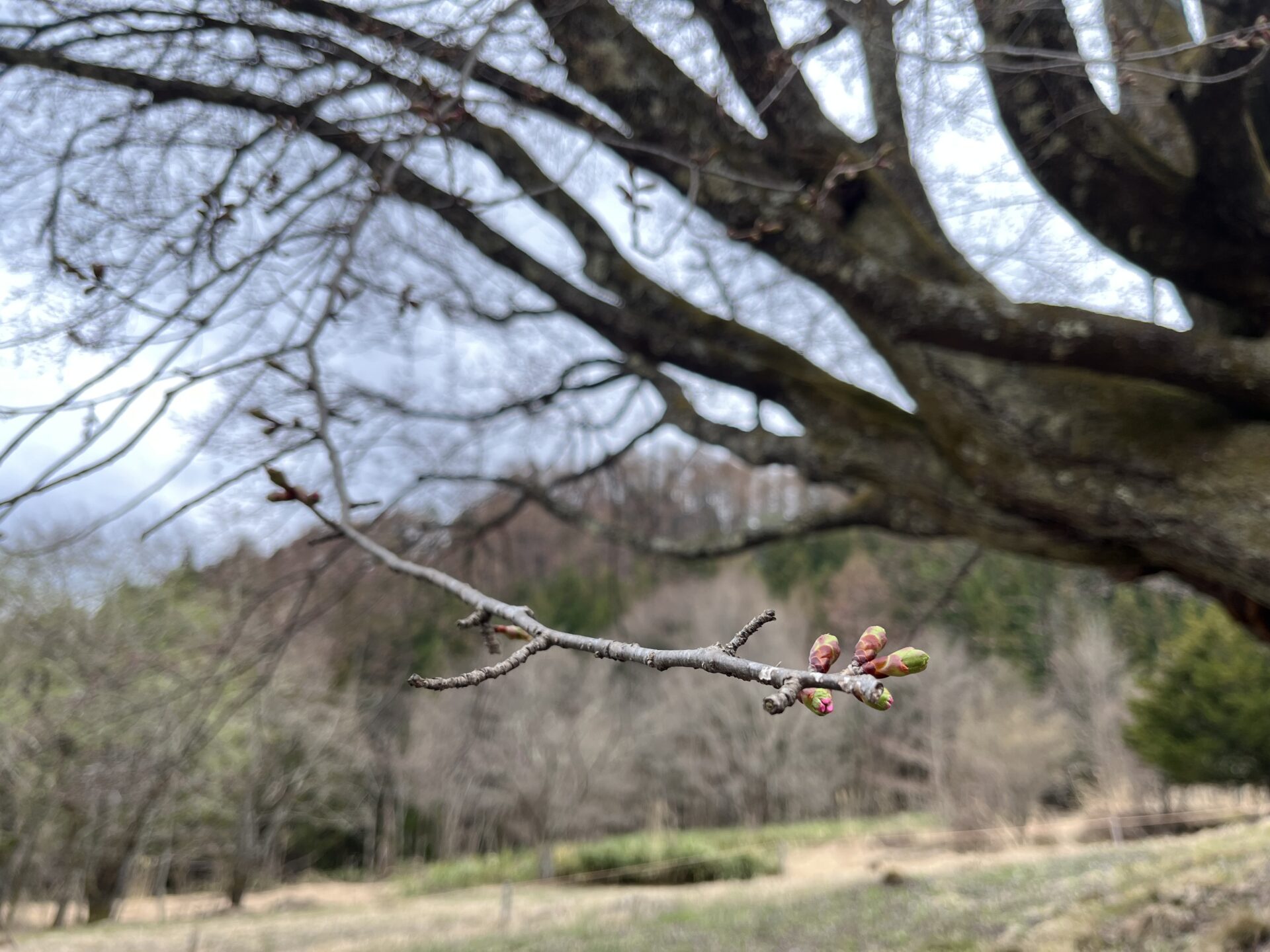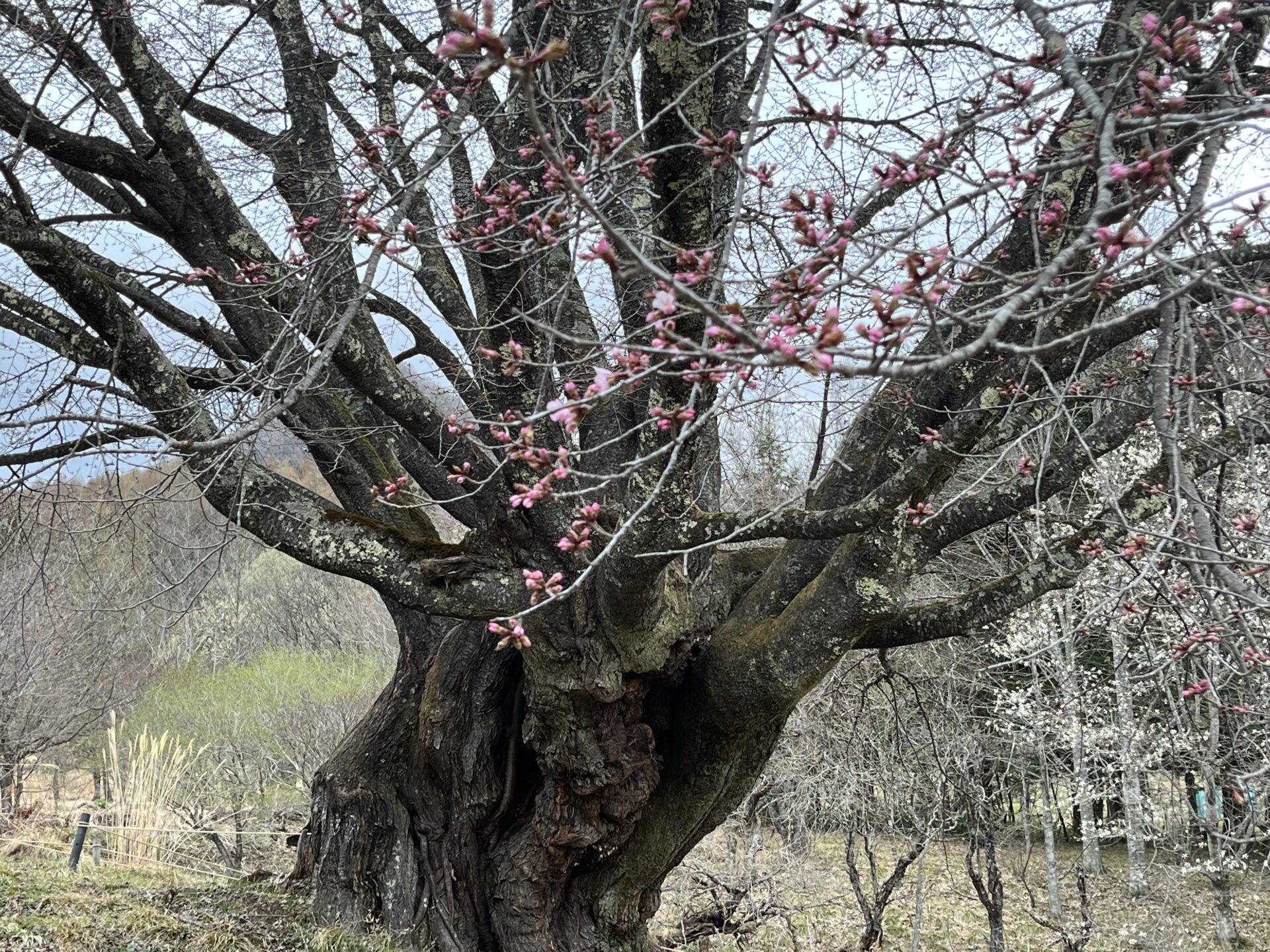 そんななか、針山の天王桜ですが、遠目からでも色づきが分かるほど蕾の色づきも進み、日の当たりの良い南側で3輪開花いたしました!