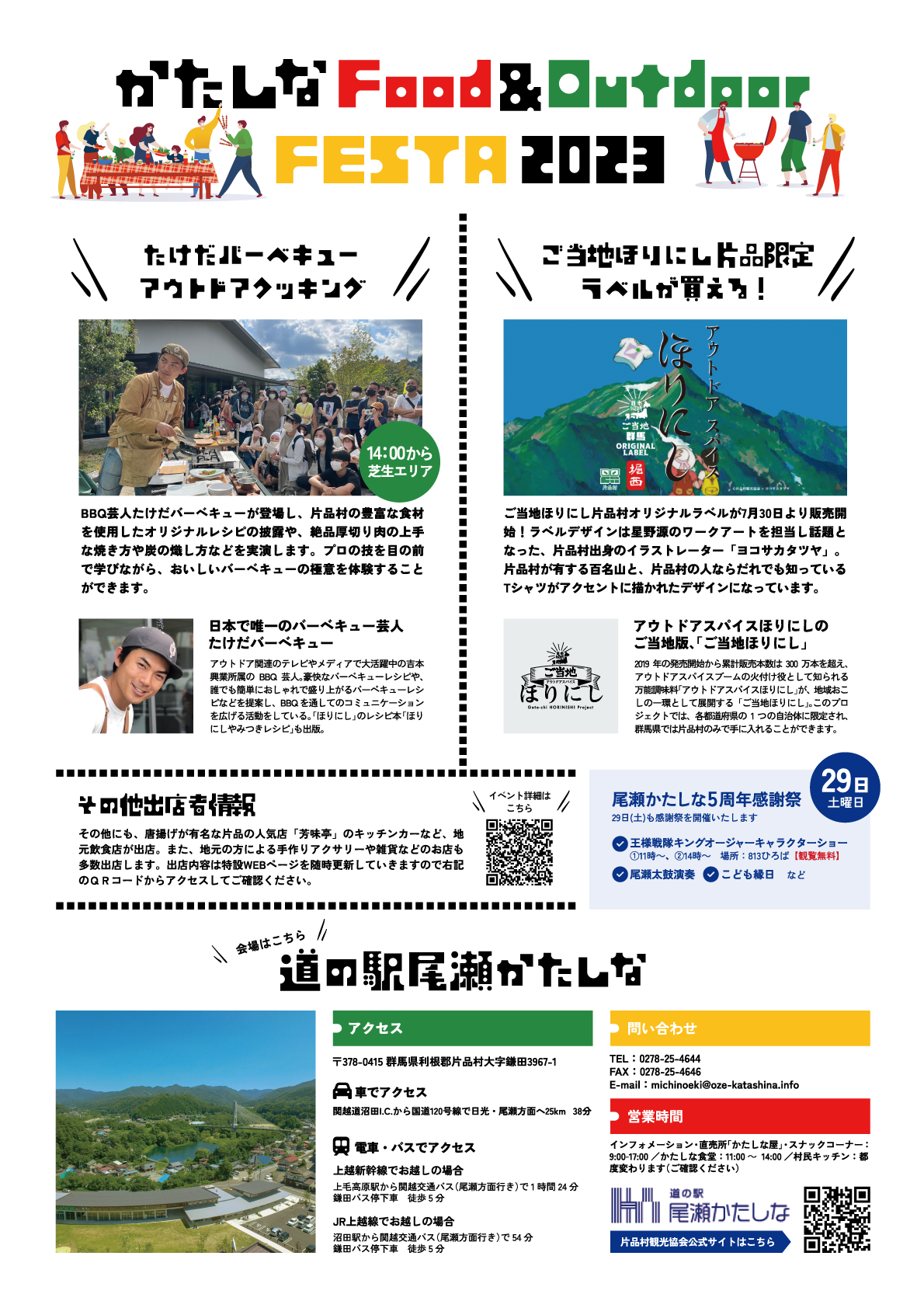 道の駅尾瀬かたしなの5周年と、アウトドアスパイスほりにし片品限定ラベルの発売を記念して、アウトドアイベントを開催します。ご当地ほりにしは、各都道府県1つの自治体に限定され、群馬県では片品村のみで手に入れる事が出来ます。