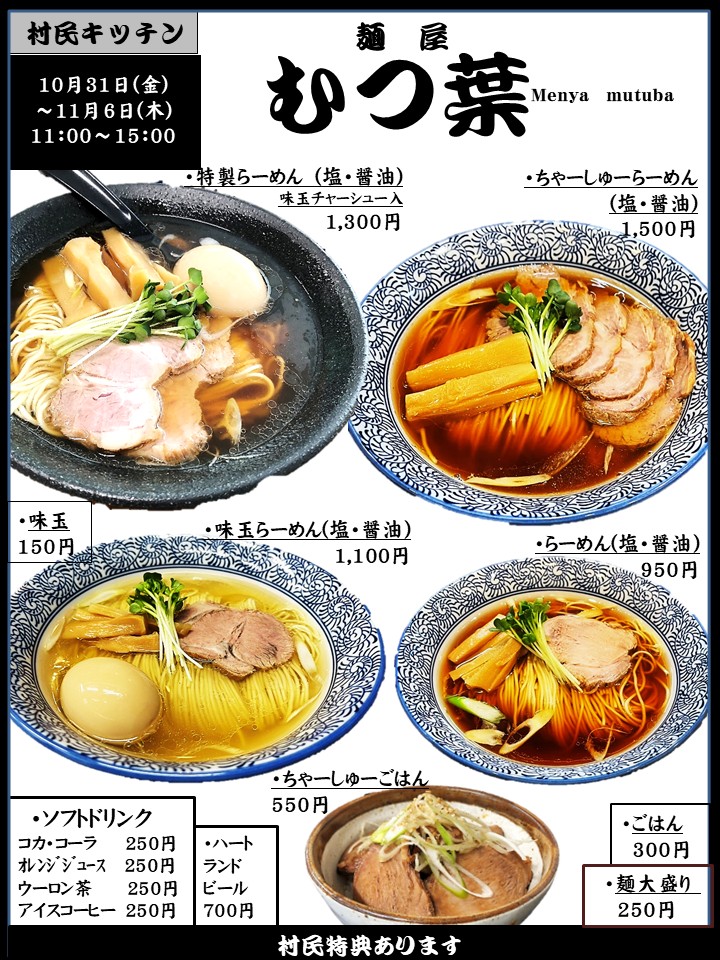 村民キッチン 村民キッチン「麺屋むつ葉」 開催日 2025年10月31日(金)-11月6日(木) 11:00-15:00 開催日: 2025年10月31日 - 2025年11月6日カテゴリー: 村民キッチン 週替わりの村民キッチン 今週末からは「麺屋むつ葉」です こだわりの特注麺を使用しています 煮干しの出汁がきいたあっさり味のスープです