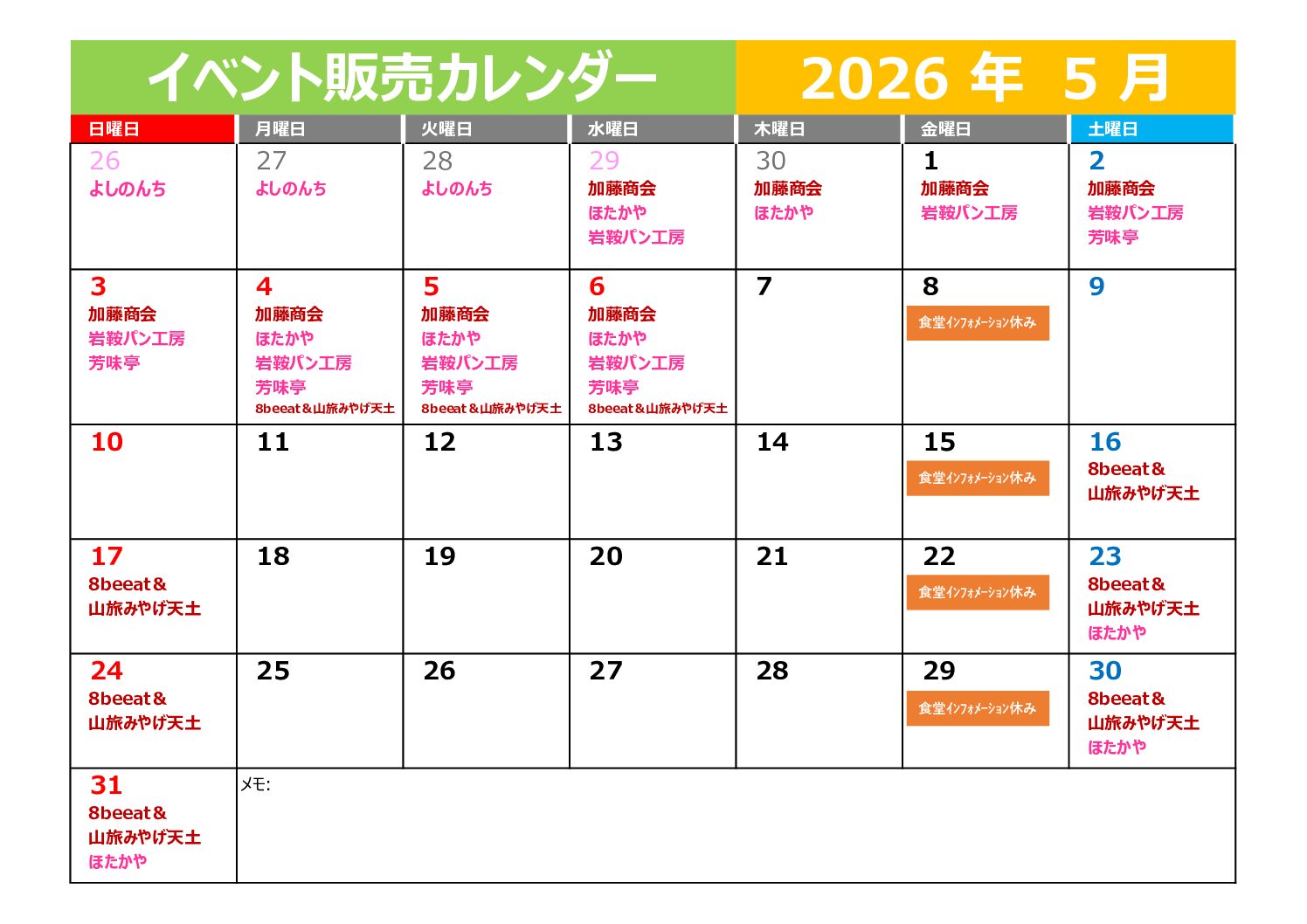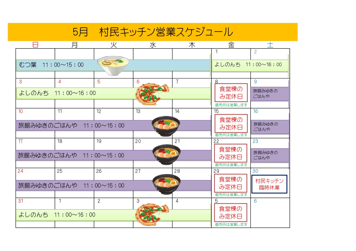 5月の村民キッチンの営業予定となります。 皆さまのご利用をお待ちしております。